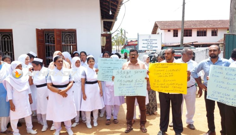 இந்த ஊர் வைத்தியசாலை வீதியில் உள்ள பொலிஸ் நிலையத்திற்கு முன்னால் இடம்பெற்ற இந்த ஆர்ப்பாட்டத்தில் ஆதார வைத்தியசாலையில் கடமையாற்றும் தாதிய உத்தியோகத்தர்கள் துணை மருத்துவ சேவையாளர்கள் சுகாதார சேவையாளர்கள் அடங்கலாக பெருந்துகையானோர் கலந்து கொண்டனர்.