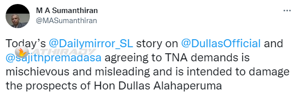 இதனையடுத்து, சுமந்திரன், குறித்த செய்தியை நிரகாரித்துள்ளதோடு, அச்செய்தி டலஸ் அழகப்பெருமவின் வெற்றியை பாதிக்கும் வகையில் திட்டமிடப்பட்டது என்றும் தனத டுவிட்டர் பதிவில் குறிப்பிட்டுள்ளார்.
