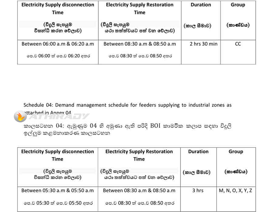 சிசி பிரிவில் காலை 6 மணி முதல் 8.30 மணி வரை 2 மணி 30 நிமிடங்களும் எம்,என்,ஓ,எக்ஸ், வை, இஸட் பிரிவுகளில் காலை 5.30 மணி முதல் 8.30 மணி வரை 3 மணி நேர மின்வெட்டும் அமுல்படுத்தப்படவுள்ளது.