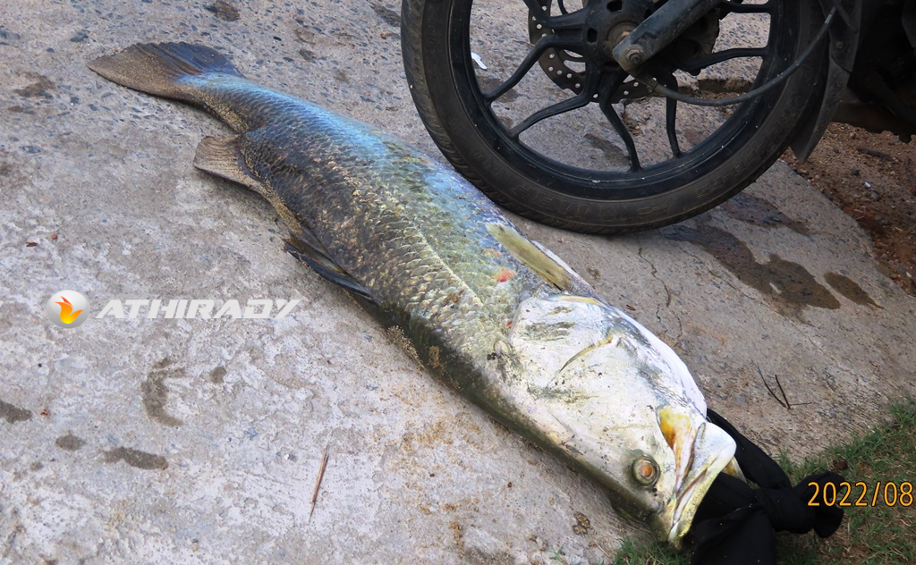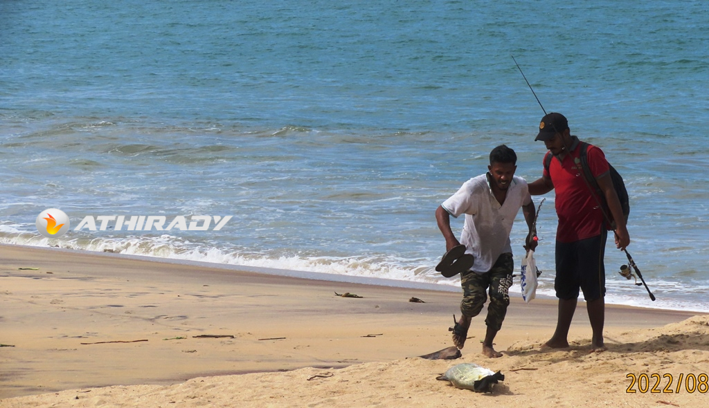 இன்று அம்பாறை மாவட்ட காரைதீவு மற்றும் நிந்தவூர் பகுதிகளை இணைக்கும் முகத்துவாரத்து கடற்கரையில் இரு இளைஞர்கள் கடலில் தூண்டில் மூலம் குறித்த மீனை பிடித்து கரைக்கு கொண்டு வந்தனர்.