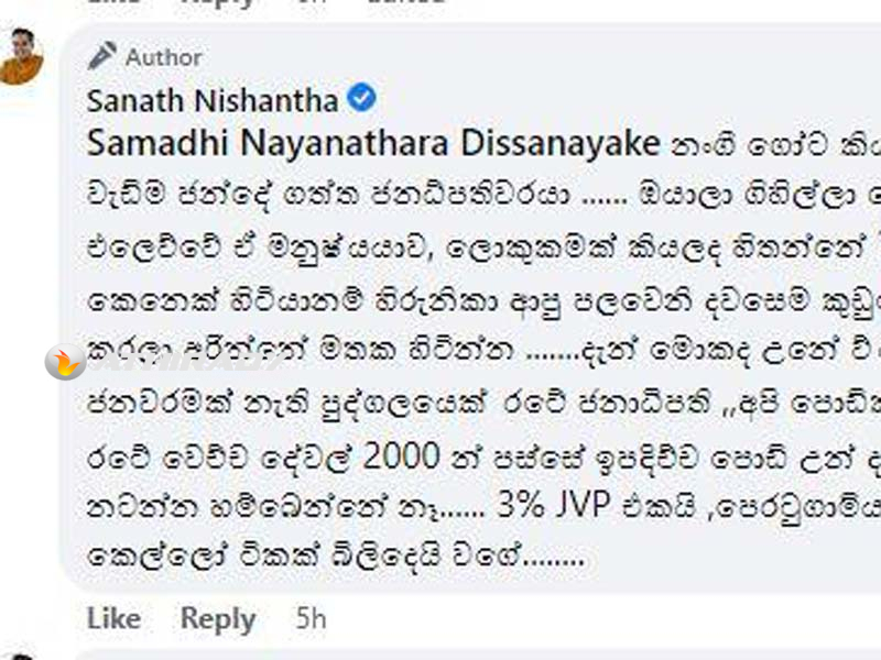 தான் ஜனாதிபதியாயிருந்தால் ஹிருணிகா பிரேமச்சந்திரவை அடித்து நிர்வாணப்படுத்தியிருப்பேன் என பொதுஜன பெரமுனவின் பாராளுமன்ற உறுப்பினர் சனத் நிஷாந்த, பேஸ்புக் பதிவொன்றில் கருத்திடும்போது குறிப்பிட்டுள்ளார்.