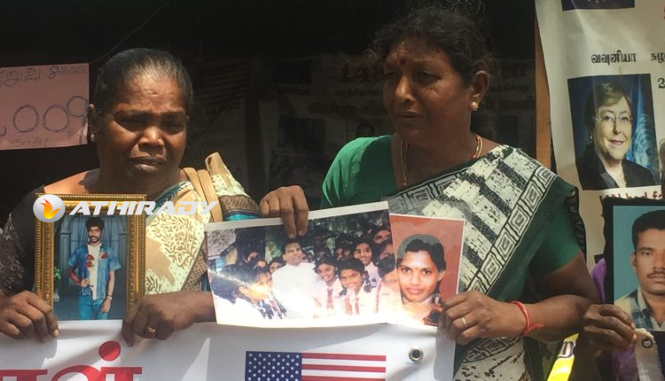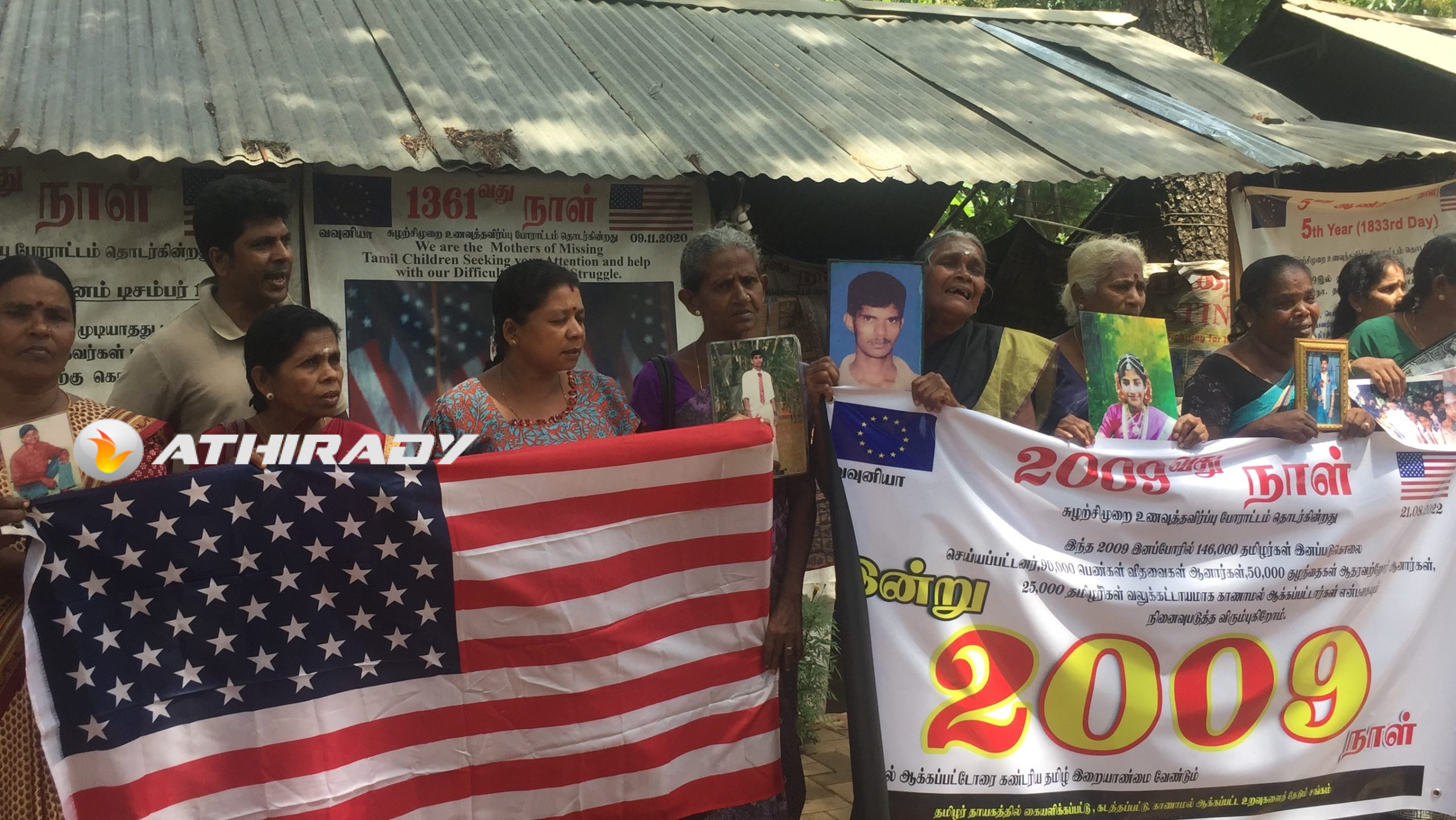 ஆர்ப்பாட்டத்தில் ஈடுபட்டவர்கள் அமெரிக்கா, ஐரோப்பிய ஒன்றியம் என்பவற்றின் கொடிகளை ஏந்தியிருந்ததுடன், காணாமல் ஆக்கப்பட்ட உறவுகளின் புகைப்படங்களையும் ஏந்தியிருந்தனர்.