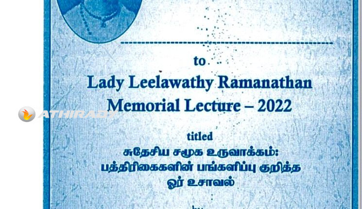 பிற்பகல் 4 மணிக்கு ஆரம்பமாகவுள்ள சீமாட்டி லீலாவதி இராமநாதன் நினைவுப் பேருரையில் “சுதேசிய சமூக உருவாக்கம் : பத்திரிகைகளின் பங்களிப்பு குறித்த ஓர் உசாவல்” என்ற தலைப்பில் தென் கிழக்கு பல்கலைக்கழக கலை, கலாசார பீடத்தின் மொழிகள் துறையைச் சேர்ந்த தமிழ்த்துறை இருக்கைப் பேராசிரியர் எம். ஏ. எம் றமீஸூம் நினைவுப் பேருரையாற்றவுள்ளனர்.