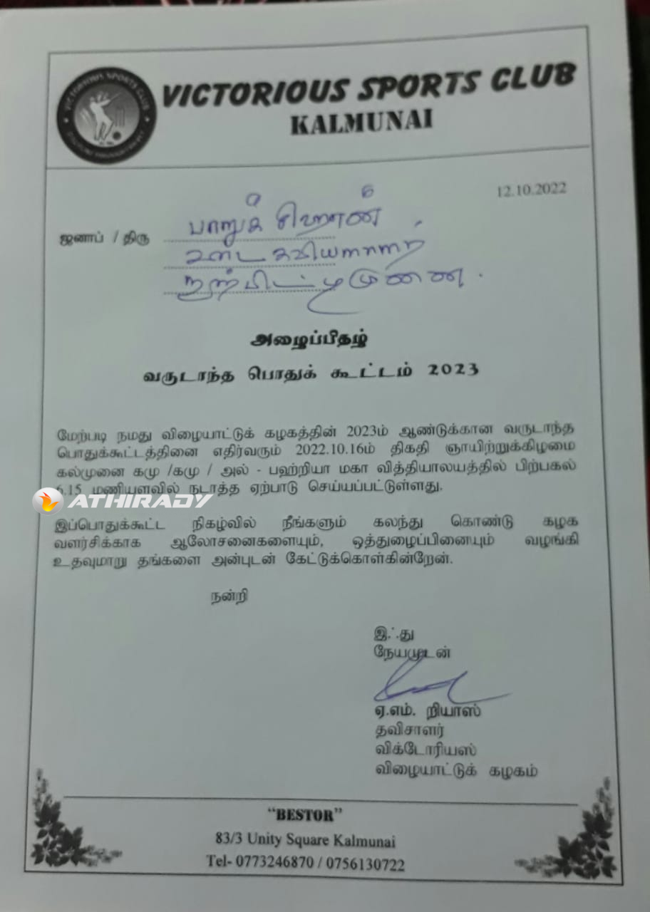 கல்முனை விக்டோறியஸ் விளையாட்டு கழக 2023 ஆம் ஆண்டிற்கான புதிய நிர்வாக சபையை தெரிவு செய்வதற்கான கழக வருடாந்த பொதுக்கூட்டம் ஞாயிற்றுக்கிழமை (16)கல்முனை அல்-பஹ்றியா மகா வித்தியாலயத்தில் மாலை சிறப்பாக நடைபெற்றது.