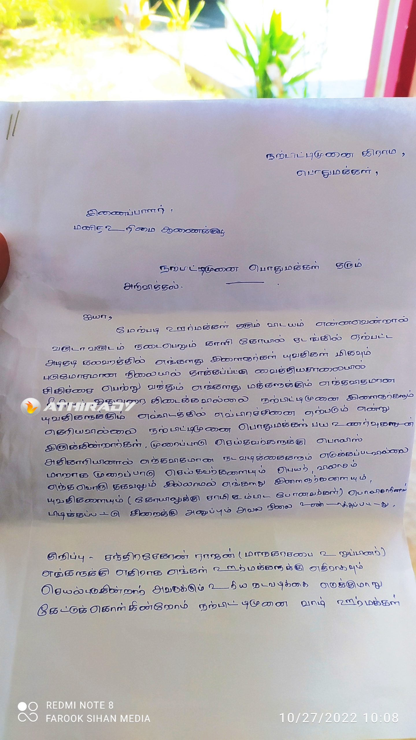 இம்மகஜரில் வருடாவருடம் நடைபெறும் காளி கோயில் சடங்கில் ஏற்பட்ட மோதலில் காயமடைந்து எங்கள் தரப்பினரும் உள்ளனர்.எனினும் இதுவரை அவர்களுக்கான நீதி பெற்றுக்கொடுக்கப்படவில்லை.முறைப்பாடு மேற்கொள்ளப்பட்டும் பொலிஸ் தரப்பில் எமக்கு தீர்வுகள் கிடைக்கப்பெறவில்லை.எனினும் இதற்கு மாறாக பொலிஸ் தரப்பினரால் எமது இளைஞர்கள் யுவதிகள் என கைது செய்யப்பட்டு சிறைக்கு அனுப்பும் சூழல் ஏற்பட்டிருக்கின்றது.குறிப்பாக கல்முனை மாநகர சபை உறுப்பினர் சந்திரசேகரம் ராஜன் என்பவர் எங்களுக்கு நீதி கிடைப்பதில் தடையாக இருக்கின்றார்.எனவே இவ்விடயத்தில் உரிய நடவடிக்கை எடுக்குமாறு கேட்டுக்கொள்வதாக தெரிவிக்கப்பட்டுள்ளது.