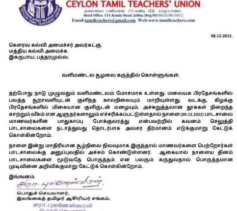 வளிமண்டல சூழலை கருத்தில் கொண்டு நாளை வெள்ளிக்கிழமை (09) பாடசாலை நடாத்துவது தொடர்பாக கல்வி அமைச்சு முடிவெடுக்க வேண்டுமென இலங்கைத் தமிழர் ஆசிரியர் சங்கம் வேண்டுகோள் விடுத்துள்ளது.