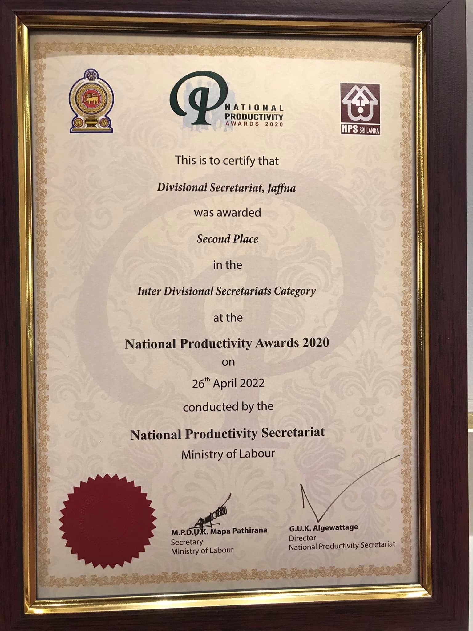 தேசிய உற்பத்தித்திறன் போட்டியில் யாழ்ப்பாணம் பிரதேச செயலகம் இரண்டாவது இடத்தைப் பெற்றுக்கொண்டுள்ளது.
