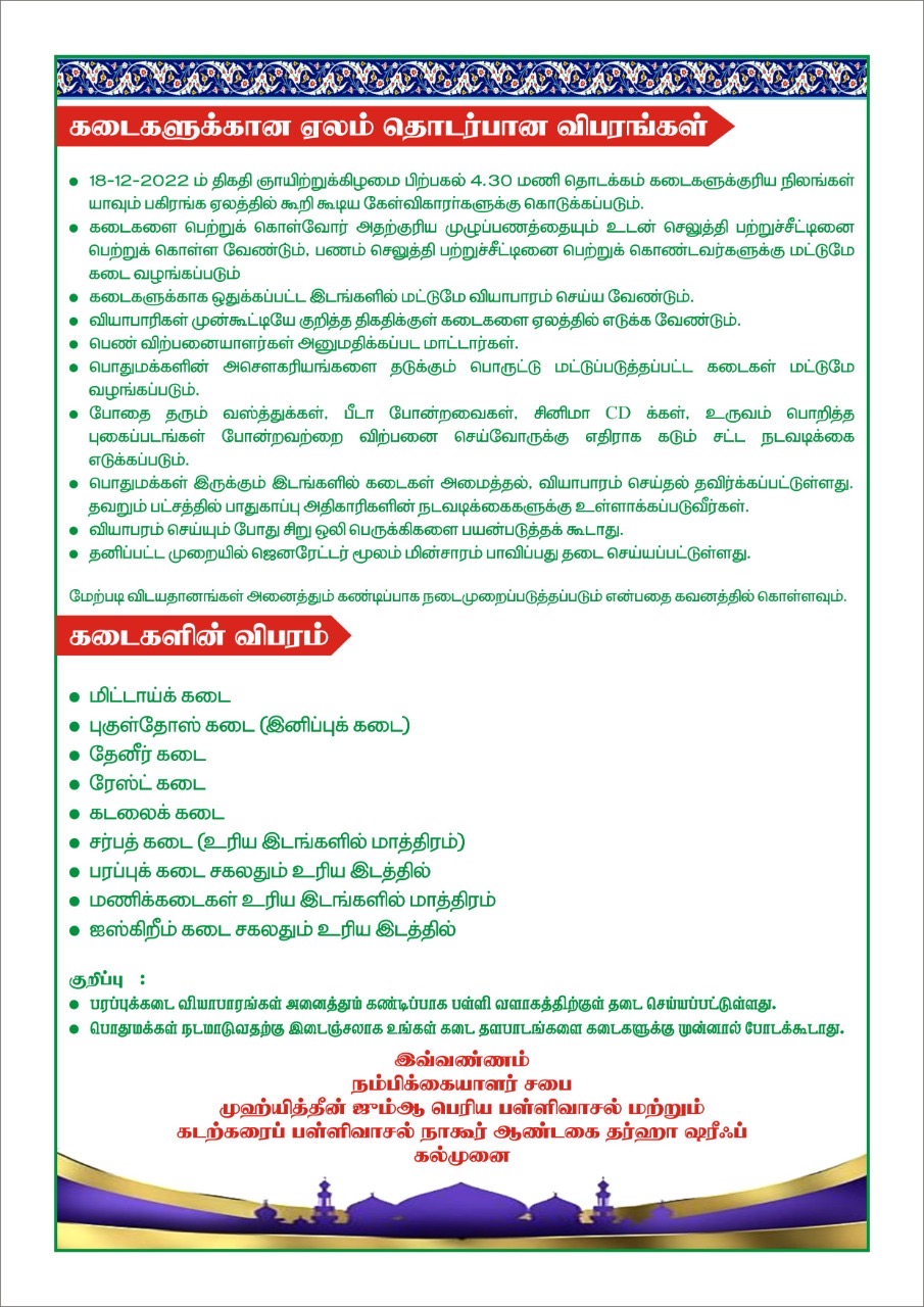 அத்துடன் கொடி இறக்கும் தினமாகிய 05.01.2023 ஆம் திகதி வியாழக்கிழமை லுஹர் தொழுகையின் பின்னர் மாபெரும் கந்தூரி அன்னதானமும் வழங்கப்பட்டு மாலை 5 மணியளவில் புனித கொடி இறக்கப்படவுள்ளமையும் சுட்டிக்காட்டத்க்கது.