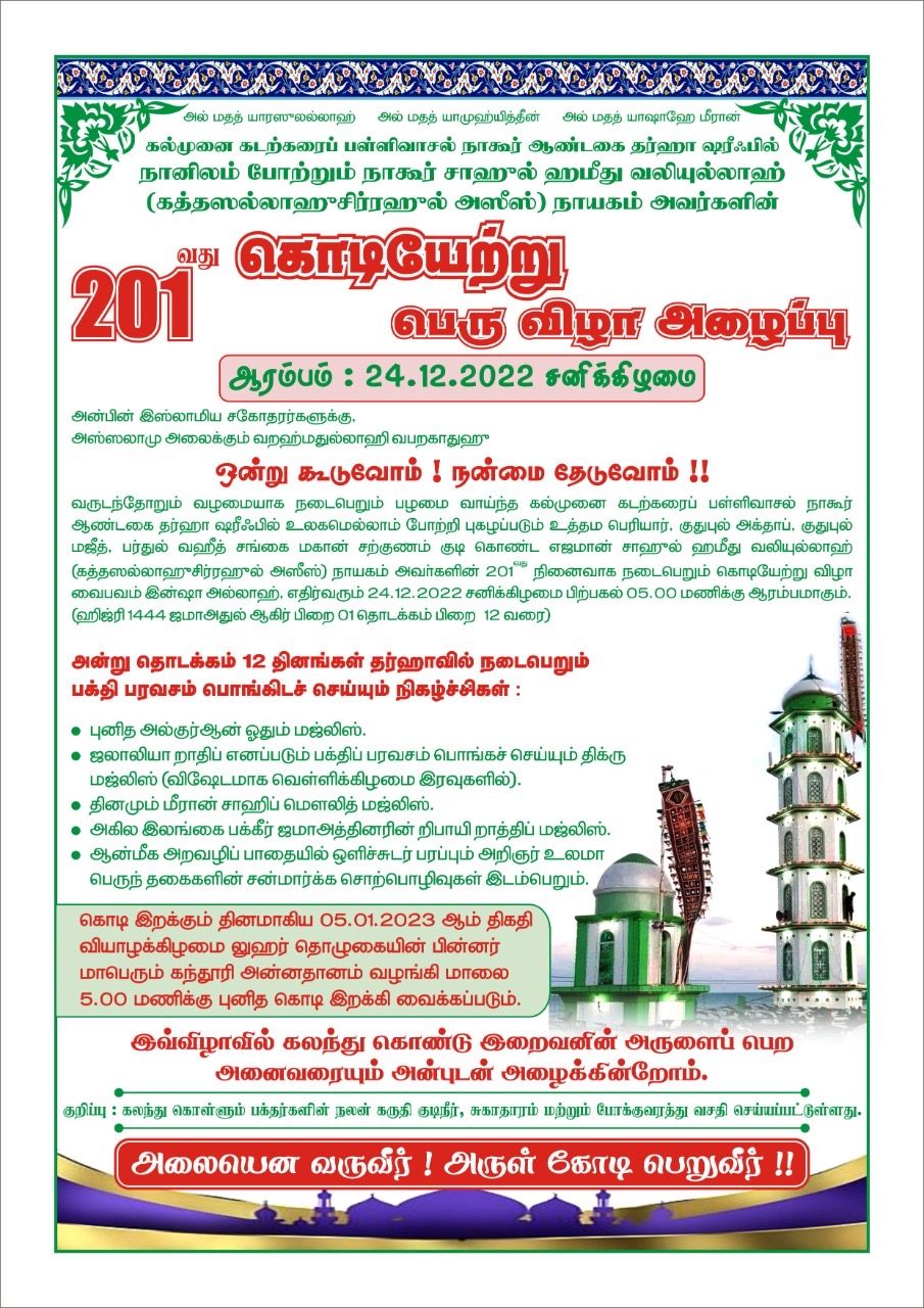 டிசம்பர் 24 ம் திகதி(சனிக்கிழமை ) ஆரம்பமாக உள்ள இவ் 201 ஆவது கொடியேற்ற விழாவினை இம் முறை சிறப்பாக நடாத்துவதற்கு பள்ளிவாசல் நிர்வாகம் பல்வேறு நடவடிக்கைகளை மேற்கொண்டுள்ளனர்.