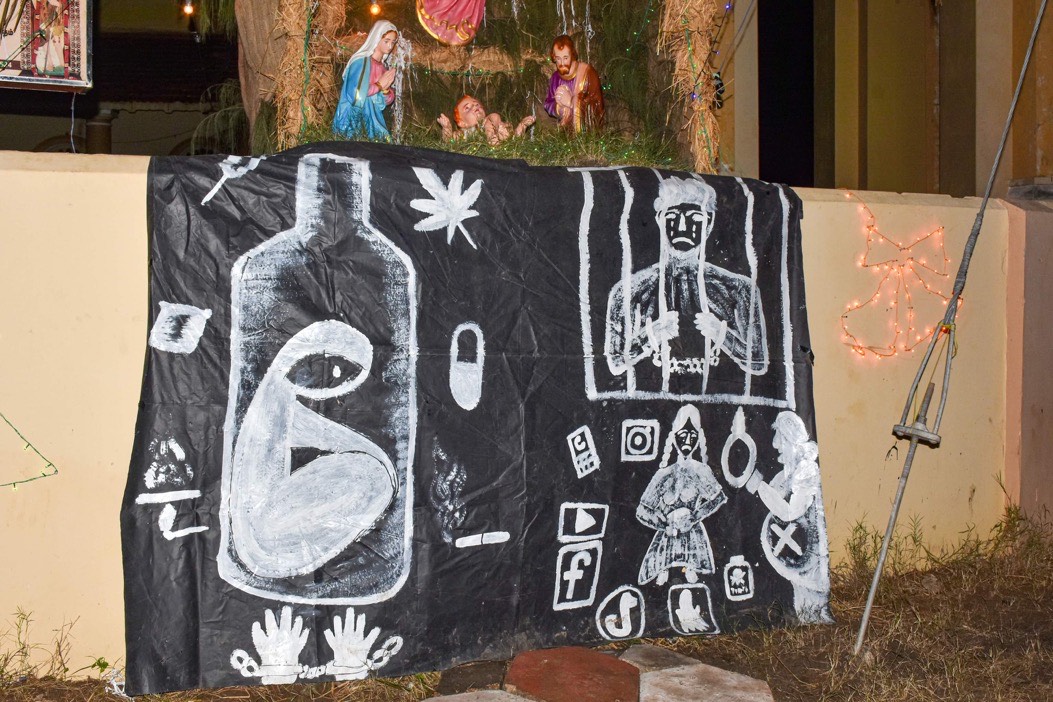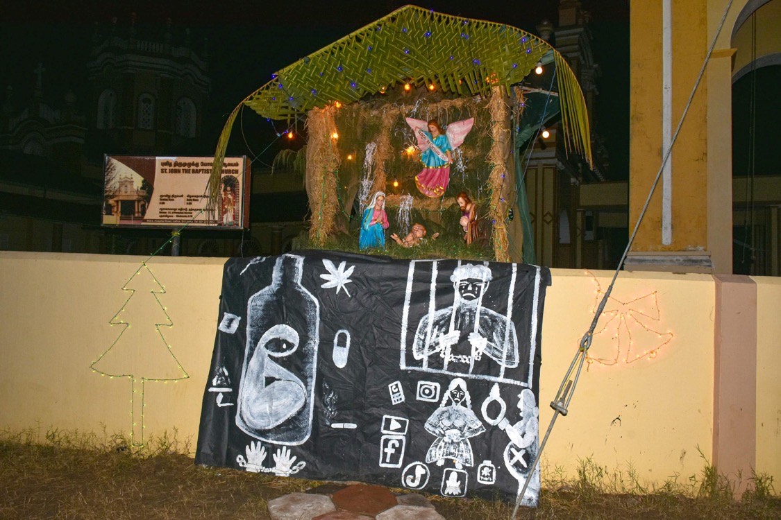 யாழ்ப்பாணம் புனித திருமுழுக்கு யோவான் ஆலயத்தில் அமைக்கப்பட்டுள்ள நத்தார் குடிலில் போதைப் பாவனை மற்றும் சமூக வலைத்தளங்களின் பாதிப்பு தொடர்பான விழிப்புணர்வு சுவரொட்டியும் காட்சிப்படுத்தப்பட்டுள்ளது.