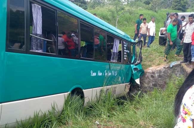 மேலும் குறித்த பஸ் வீதியை விட்டு விலகி சுமார் 100 மீற்றர் தூரம் பயணித்து பாறையில் மோதி விபத்துக்கு உள்ளாகியுள்ளதாக மேலும் தெரிவிக்கப்படுகின்றது.