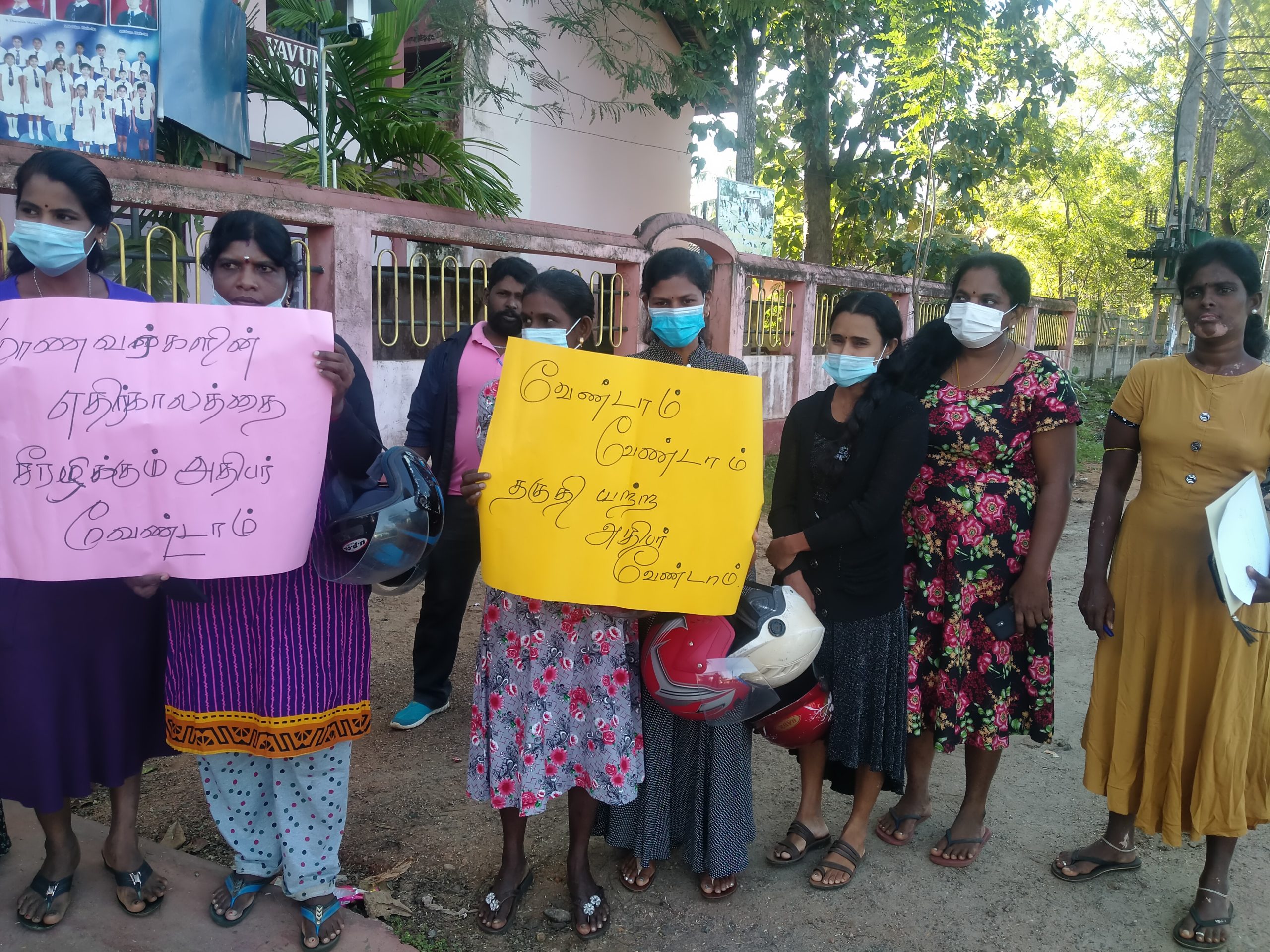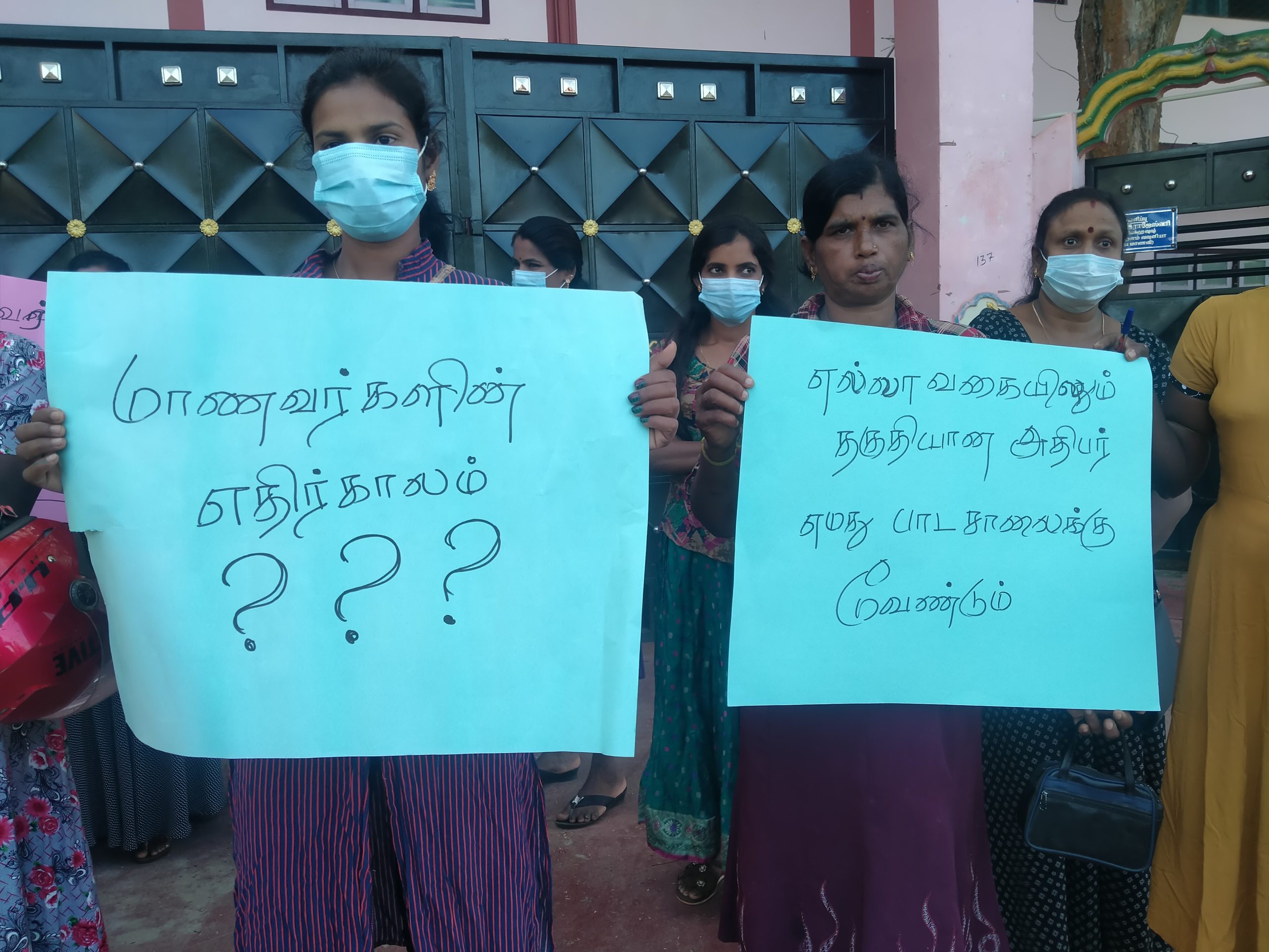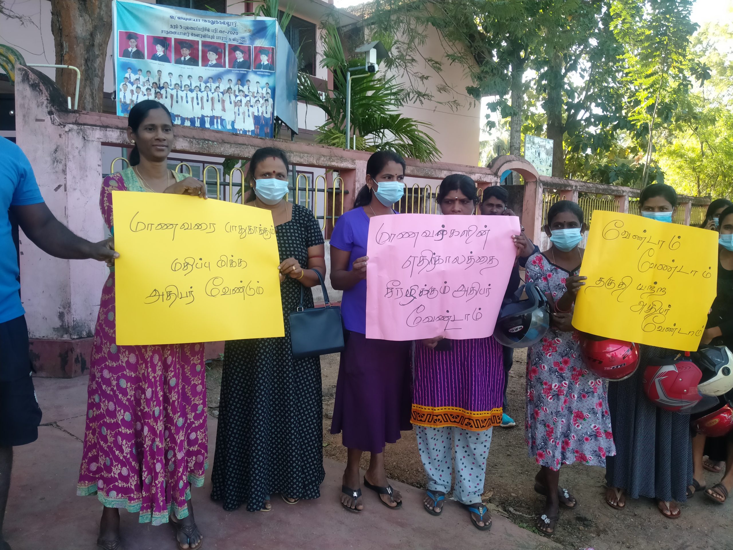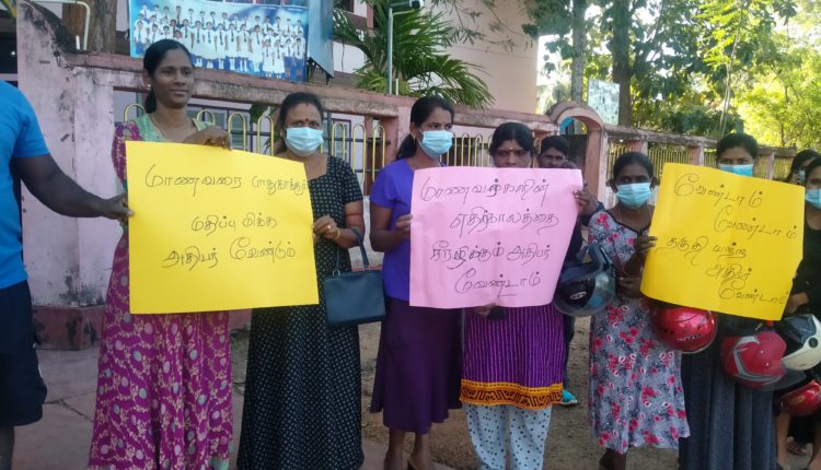கண்டன ஆர்ப்பாட்டத்தில் ஈடுபட்டிருந்தவர்கள், எல்லா வகையிலும் தகுதியான அதிபர் எமது பாடசாலைக்கு வேண்டும், மாணவர்களை பாதுகாக்கும் மதிப்பு மிக்க அதிபர் வேண்டும், மாணவர்களின் எதிர்காலத்தை சீரழிக்கும் அதிபர் எமக்கு வேண்டாம், வேண்டாம், வேண்டாம் தகுதியற்ற அதிபர் எமக்கு வேண்டாம் போன்ற பதாதைகளை தாங்கியிருந்தனர்.