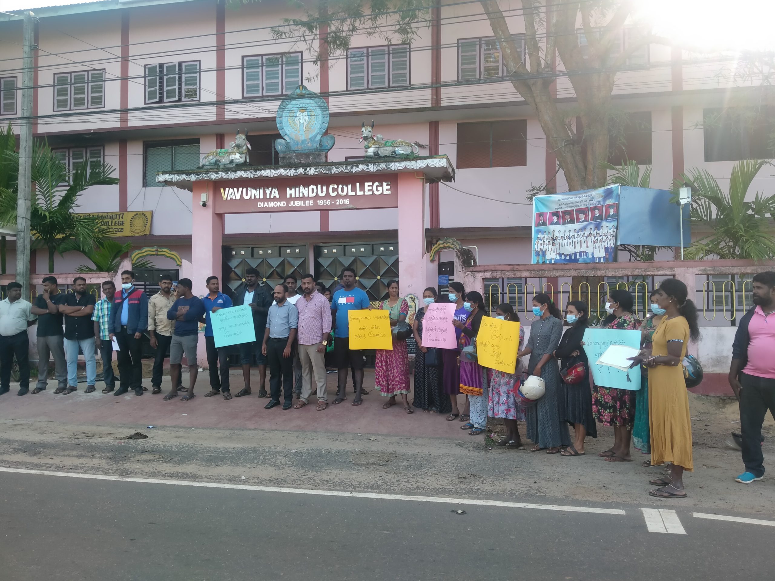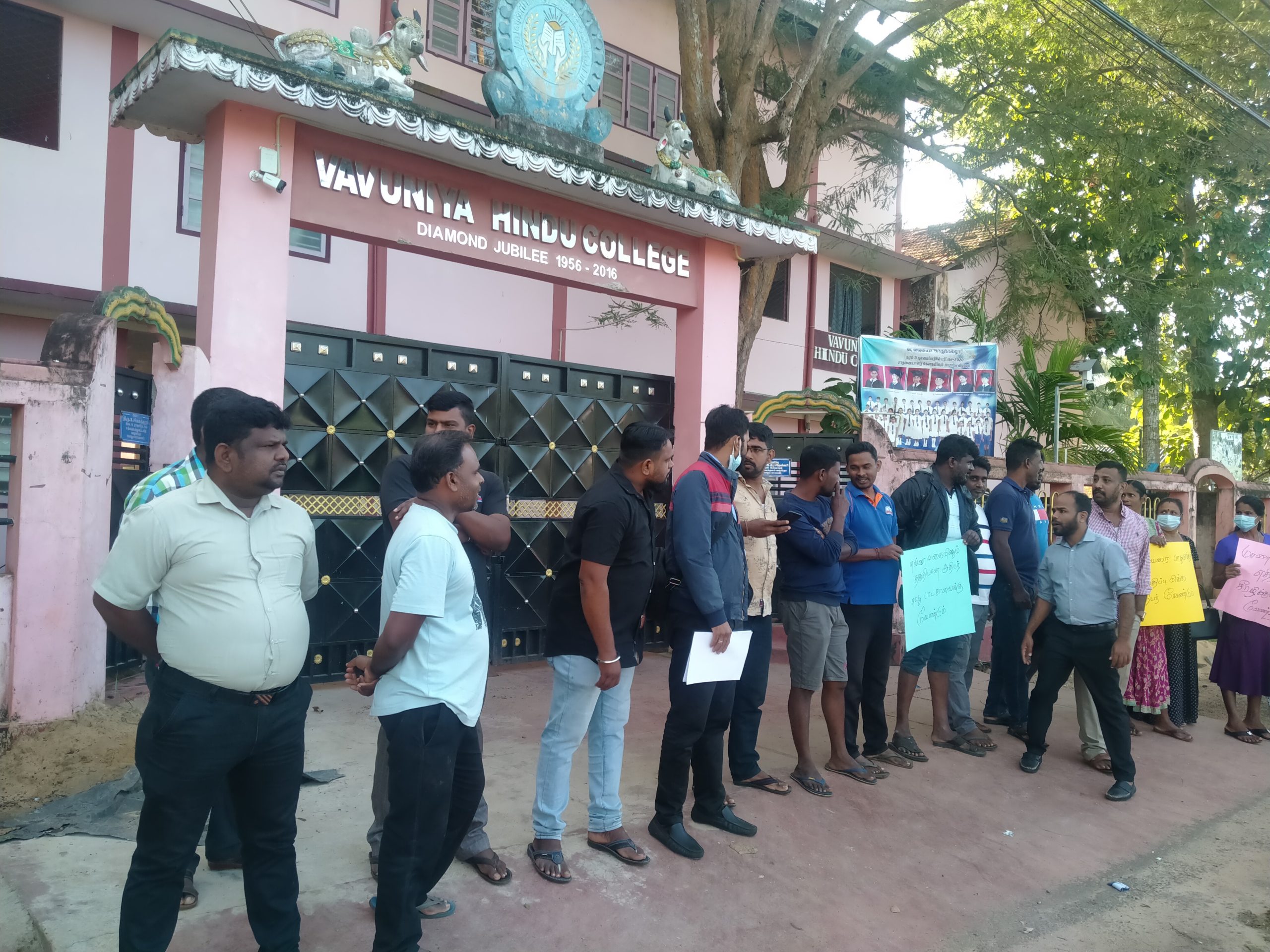 கோவில்குளம் இந்துக்கல்லூரியில் புதிய அதிபர் நியமனத்திற்கு எதிர்ப்பு தெரிவித்தே கல்லூரி மாணவர்களின் பெற்றோர்கள் மற்றும் ஆசியர்கள் அமைதியான கண்டன ஆர்ப்பாட்டத்தில் கலந்துகொண்டிருந்தனர்.