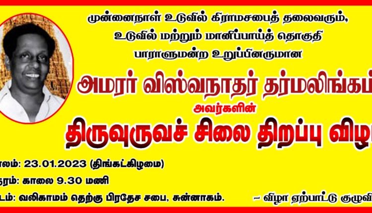 முன்னைநாள் உடுவில் கிராம சபைத் தலைவரும், 23 ஆண்டுகள் தொடர்ச்சியாக உடுவில் மற்றும் மானிப்பாய் தொகுதிகளின் நாடாளுமன்ற உறுப்பினராகவும் இருந்த இலங்கைத் தமிழரசுக் கட்சியின் மூத்த தலைவர்களில் ஒருவரான அமரர் வி. தர்மலிங்கத்தின் திருவுருவச் சிலை திறப்பு விழா நாளை, 23 ஆம் திகதி திங்கட்கிழமை முற்பகல் 9:30 மணிக்கு சுன்னாகத்தில் அமைந்துள்ள வலிகாமம் தெற்கு பிரதேச சபை வளாகத்தில் நடைபெறவுள்ளது.