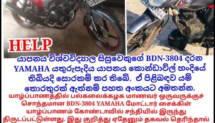 யாழ்ப்பாணம் பல்கலைக்கழக மாணவனின் மோட்டார் சைக்கிள் திருட்டுப் போயுள்ளமை தொடர்பில் அதனை கண்டுபிடிக்க பொதுமக்களின் உதவியை பொலிஸார் நாடியுள்ளனர்.