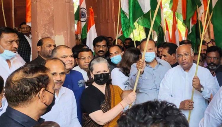 மேலும், மத்திய அரசை கண்டித்து காங்கிரஸ் உள்ளிட்ட எதிர்க்கட்சிகளின் எம்.பி.க்கள் பாராளுமன்ற வளாகத்தில் இருந்து விஜய் சவுக் வரை மூவர்ணக் கொடி பேரணி நடத்தினர். காங்கிரஸ் தலைவர் மல்லிகார்ஜூன கார்கே தலைமையில் நடந்த இந்த பேரணியில் காங்கிரஸ், திமுக, சமாஜ்வாடி, ஆர்ஜேடி, சிவ சேனா (உத்தவ் தாக்கரே பிரிவு), ஆம் ஆத்மி கட்சி, தேசியவாத காங்கிரஸ் மற்றும் கம்யூனிஸ்ட் எம்.பி.க்கள் கலந்துகொண்டனர். அனைவரும் மூவர்ணக் கொடியை ஏந்தி சென்றனர். பேரணி தொடங்குவதற்கு முன்பாக, பாராளுமன்ற முதல் வாயிலில் எம்.பி.க்கள் திரண்டிருந்தபோது சோனியா காந்தியும் தேசியக்கொடியுடன் பங்கேற்றார். பாஜக ஆட்சியில் ஜனநாயகம் தாக்குதலுக்கு உள்ளாவதாக எதிர்க்கட்சிகள் குற்றம்சாட்டின.