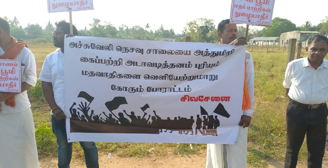 அரசிற்கு சொந்தமான அச்சுவேலி நெசவு சாலையை அத்துமீறி கைப்பற்றி அடாவடித்தனம் புரியும் மதப்பிரிவினரே வெளியேறுங்கள் என கோரி போராட்டம் ஒன்று முன்னெடுக்கப்பட்டது. அச்சுவேலி நெசவு சாலை முன்றலில் இன்றைய தினம் செவ்வாய்க்கிழமை சிவசேனை அமைப்பின் ஏற்பாட்டில் இப் போராட்டம் முன்னெடுக்கப்பட்டது. குறித்த நெசவு சாலை யுத்தத்தின் பின் இயங்கவில்லை என தெரிவிக்கப்படுகிறது.அதன் பின்னர் குறித்த கட்டிடத்தில் ஒரு மதஸ்தலம் ஒன்று அமைக்கப்பட்டு பிரார்த்தனை வழிபாடுகள் முன்னெடுக்கப்பட்டு வந்துள்ளது. குறித்த மத ஸ்தலத்தினால் சுற்றுசூழலில் அதிகளவு சத்தம் போட்டு … Continue reading அச்சுவேலியில் நெசவுசாலையை ஆக்கிரமித்துள்ள மத சபையை வெளியேற்ற கோரி ஆர்ப்பாட்டம்!! (PHOTOS)