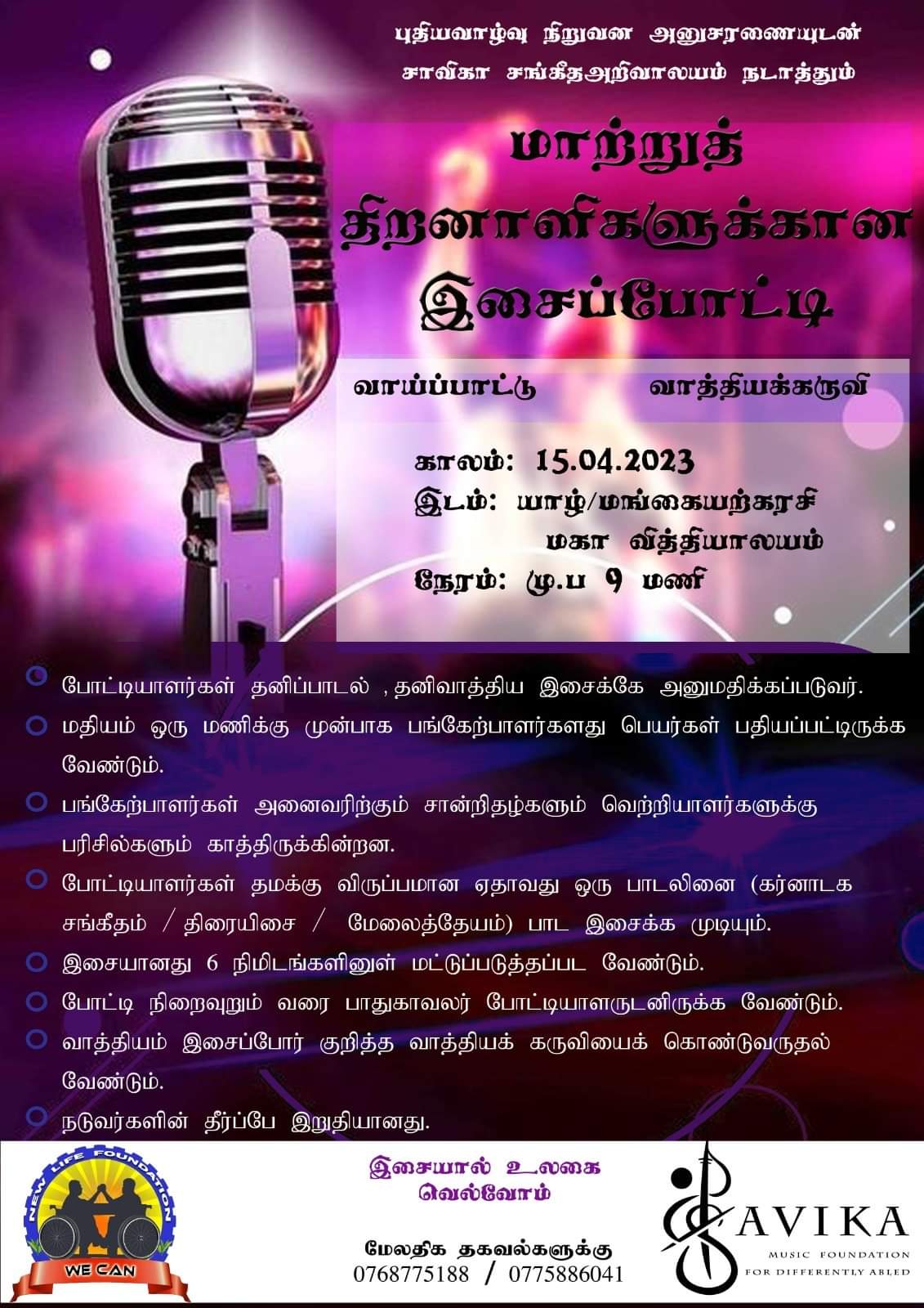 வடக்கு மாகாண மாற்றுத்திறனாளிகளின் இசை திறமையை வெளிக்கொண்டு வரும் முகமாக முதல் முறையாக மாற்றுத் திறனாளிகளுக்கான மாபெரும் இசை போட்டி யாழ்ப்பாணத்தில் இடம்பெற உள்ளது.