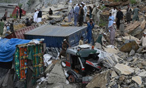 பாகிஸ்தானின் வடமேற்கு பகுதியில் உள்ள கைபர் பக்துங்வா மாகாணத்தில் நேற்று அதிகாலை கனமழை பெய்தது. அந்த நேரத்தில் ஆப்கானிஸ்தானின் எல்லையில் அமைந்துள்ள கைபர் கணவாய் அருகே டோர்காம் நெடுஞ்சாலையில் லாரிகள் உள்ளிட்ட பல வாகனங்கள் சென்று கொண்டிருந்தன. அப்போது அங்கு திடீரென நிலச்சரிவு ஏற்பட்டது. இதில் சாலையில் சென்று கொண்டிருந்த 20 லாரிகள் மண்ணுக்குள் புதைந்தன.
