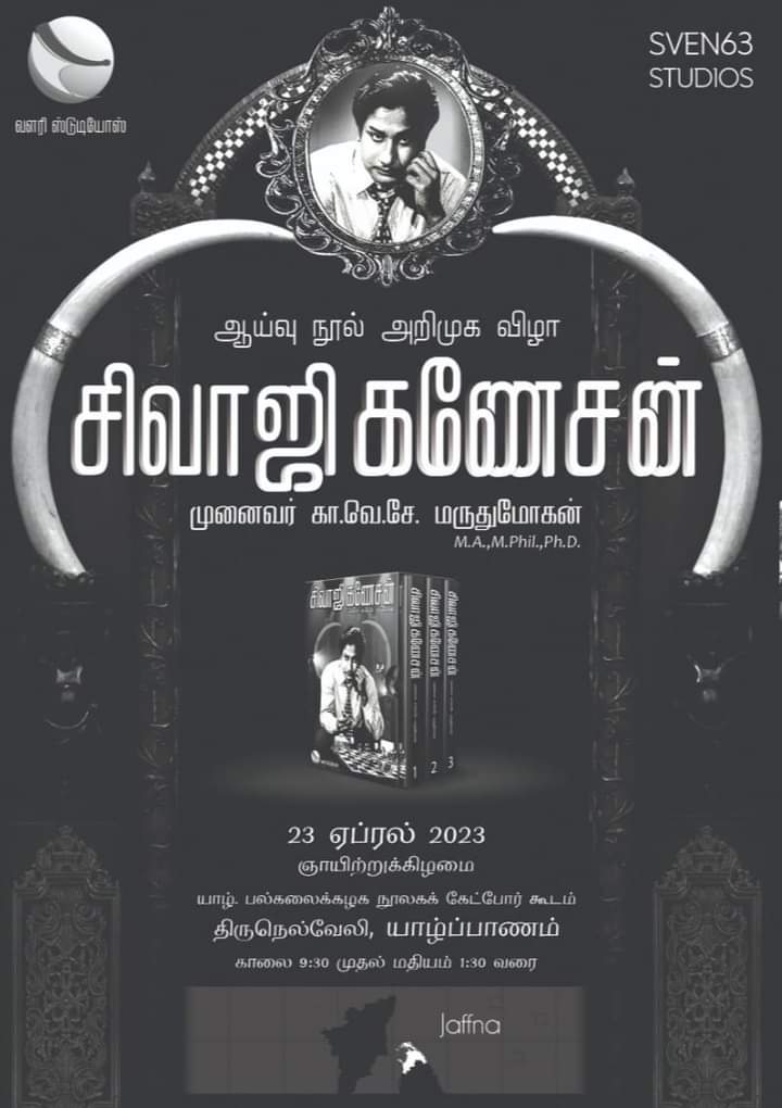 நடிகா் திலகம் சிவாஜி கணேசன் குறித்து தமிழகத்தைச் சோ்ந்த ஆய்வாளா் முனைவா் மருதுமோகன், சென்னை பல்கலைக்கழகத்தில் ஆய்வு செய்து எழுதிய “சிவாஜி கணேசன்” எனும் நூலின் அறிமுக விழா எதிா்வரும் ஞாயிற்றுக்கிழமை காலை 9.30 மணிக்கு யாழ். பல்கலைக்கழக நூலக கேட்போா் கூடத்தில் நடைபெறவுள்ளது.