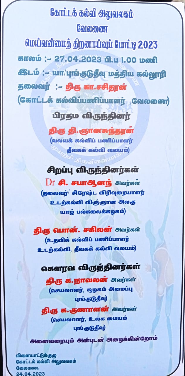 இப்போட்டியின் இறுதி நிகழ்வுகள் வேலணை கோட்ட கல்விப் பணிப்பாளர் திரு. கா. சசிதரன் அவர்களின் தலைமையில் 27 – 04 – 2023 அன்று பிற்பகல் 1.00 மணிக்கு ஆரம்பமாகவுள்ளன .