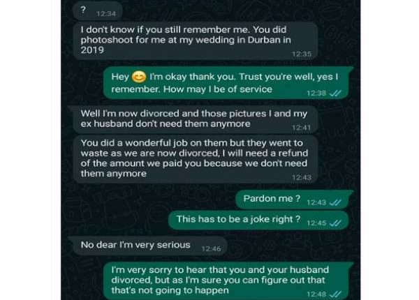 எனக்கு 2019ஆம் ஆண்டு டர்பனில் திருமணம் நடந்தது. தற்போது நாங்கள் விவாகரத்து பெற்று விட்டோம். நீங்கள் திருமணத்திற்கு எடுத்த புகைப்படங்கள் எல்லாம் எனக்கும் என்னுடைய முன்னாள் கணவருக்கும் தேவையில்லை. நீங்கள் அழகாக போட்டோ ஷூட் செய்திருந்தீர்கள். ஆனால் நாங்கள் விவாகரத்து பெற்றதால் நீங்கள் பட்ட பாடெல்லாம் வீணாகிவிட்டது. அந்த புகைப்படங்கள் எனக்கு வேண்டாம் என்பதால் திருமணத்திற்கு புகைப்படம் எடுக்க கொடுத்த பணத்தை திருப்பி கொடுத்துவிடுங்கள் என கேட்டிருந்தார். இதை முதலில் பார்த்த போட்டோகிராபர் யாரோ நம்மிடம் பிராங்க் செய்கிறார்கள் என நினைத்துள்ளார். பிறகுதான் அந்த பெண் உண்மையிலேயே நம்மிடம் கொடுத்த காசை திருப்பி கேட்கிறார் என்பதை அறிந்த அந்த புகைப்பட கலைஞர், போட்டோ பிரிண்ட் போட்டு கொடுத்தாகிவிட்டது, இனி அவை உங்களுக்கு வேண்டாம் என்றால் நீங்கள் என்ன வேண்டுமானாலும் செய்யுங்கள்.