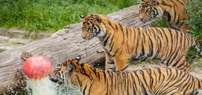 லண்டன் உயிரியல் பூங்காவில் அரியவகை சுமத்ரா புலிகள் பராமரிப்பு: முதன்முறையாக குளத்தில் இறங்கி விளையாடி குதூகலம்!!