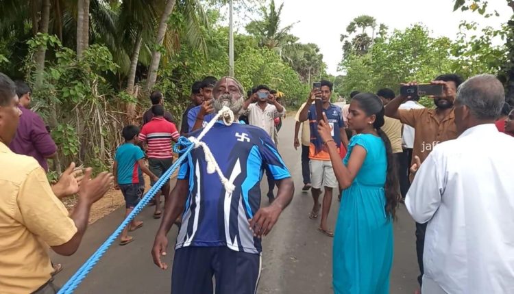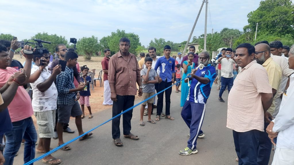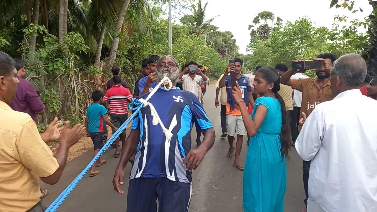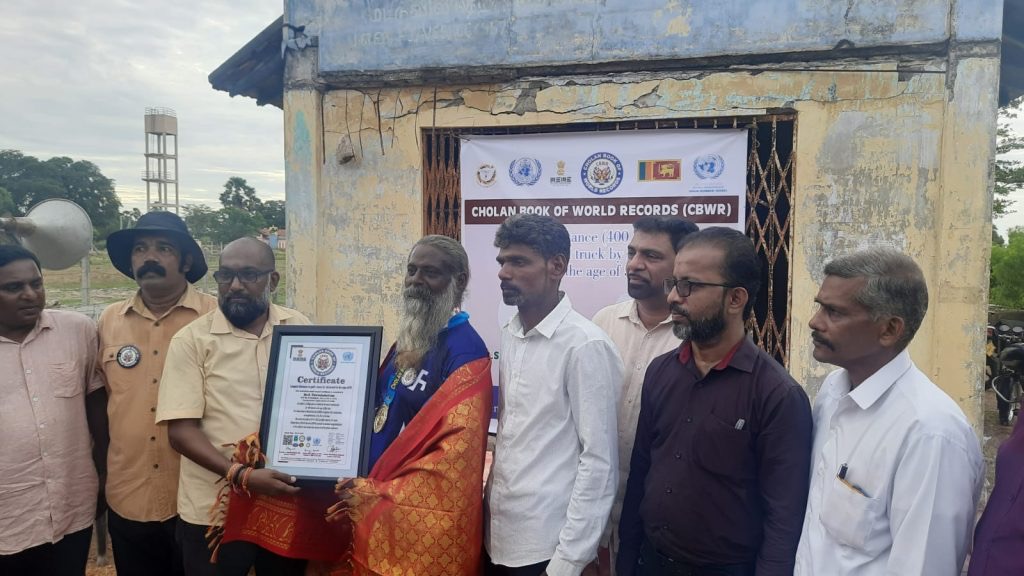 7 நிமிடங்கள் 48 செக்கன்களில் ஆயிரத்து 550 கிலோ கிராம் எடை கொண்ட ஊர்தியை 400 மீற்றர் தூரம் தாடியால் இழுத்து தென்மராட்சி மட்டுவிலைச் சேர்ந்த 59 வயதான செ.திருச்செல்வம் உலக சாதனை படைத்துள்ளார்.