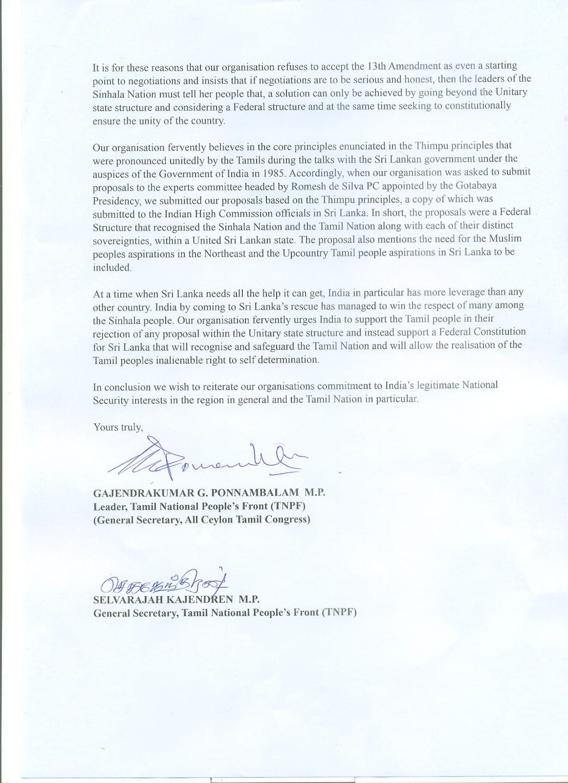 இந்த நிலையில் ஈழத் தமிழ் மக்களின் அடிப்படை பிரச்சனைகள் அரசியல் தீர்வுகளை சுட்டிக்காட்டி இலங்கை ஜனாதிபதிக்கு அழுத்தம் கொடுக்கும் வகையில் இந்தியப் பிரதமருக்கு தமிழ்க் கட்சிகள் பல இணைந்து ஒருமித்து கடிதம் அனுப்ப நடவடிக்கை எடுத்து வருகின்றன.