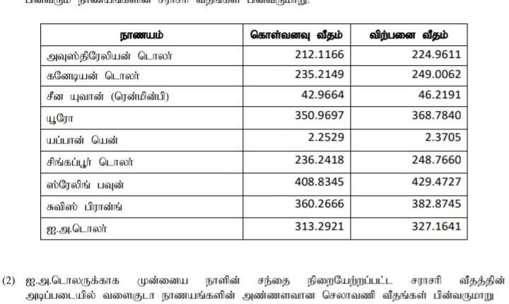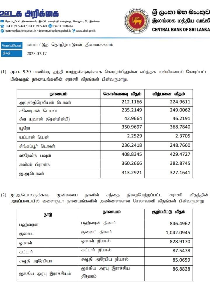 இன்று ஜூலை 17 மத்திய வங்கி வெளியிட்டுள்ள நாணயமாற்று விகிதத்தின் படி ஐக்கிய அமெரிக்க டொலரின் கொள்வனவு விலை ரூபா 313.2921 ஆகவும் விற்பனை விலை ரூபா 327.1641 ஆகவும் பதிவாகியுள்ளது.