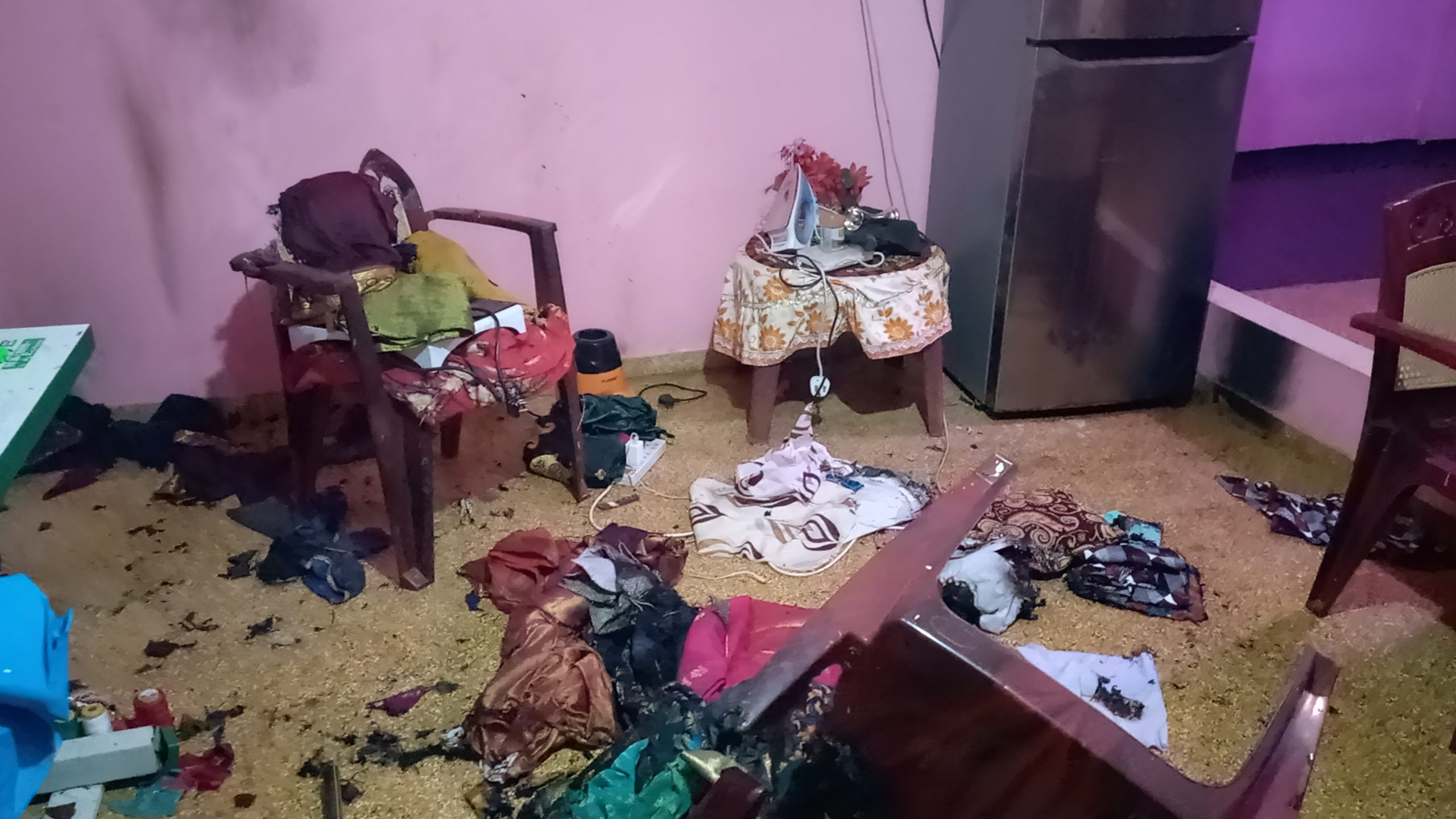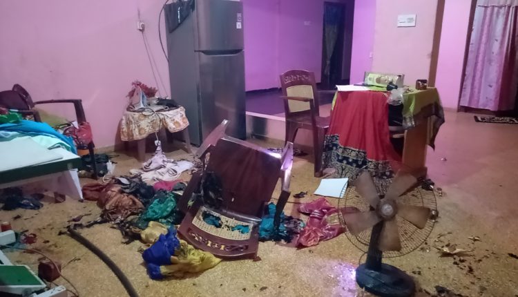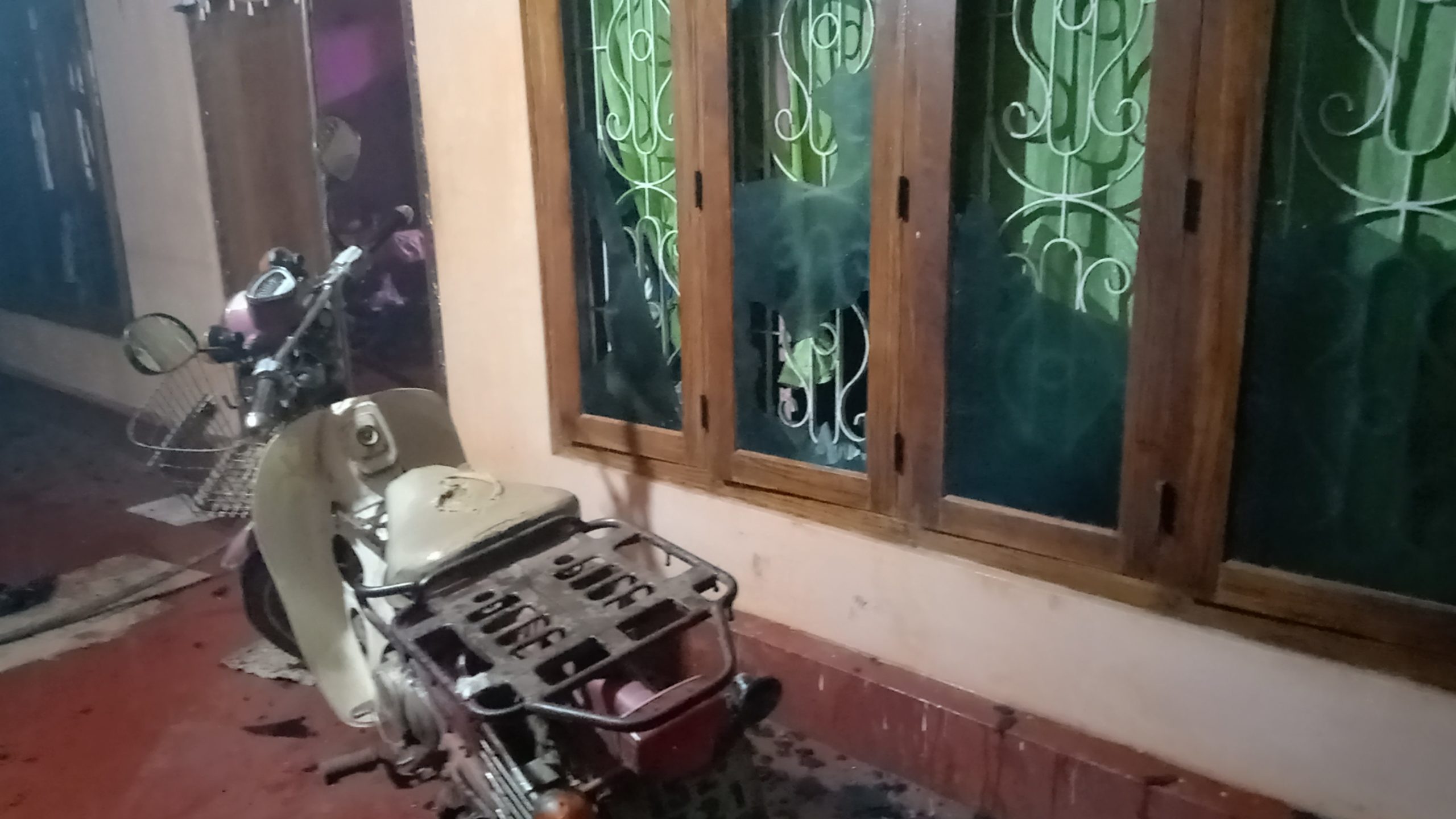முகங்களை கறுப்பு துணியால் மூடி கட்டியவாறு , இரண்டு மோட்டார் சைக்கிளில் வந்த 06 பேர் கொண்ட கும்பல் வீட்டினுள் அத்துமீறி நுழைத்து , ஜன்னல் கண்ணாடிகளை அடித்து நொறுக்கி , வீட்டினுள் சென்று , அங்கிருந்த பொருட்களையும் அடித்து நொறுக்கி பெற்றோல் குண்டு வீசியுள்ளனர்.