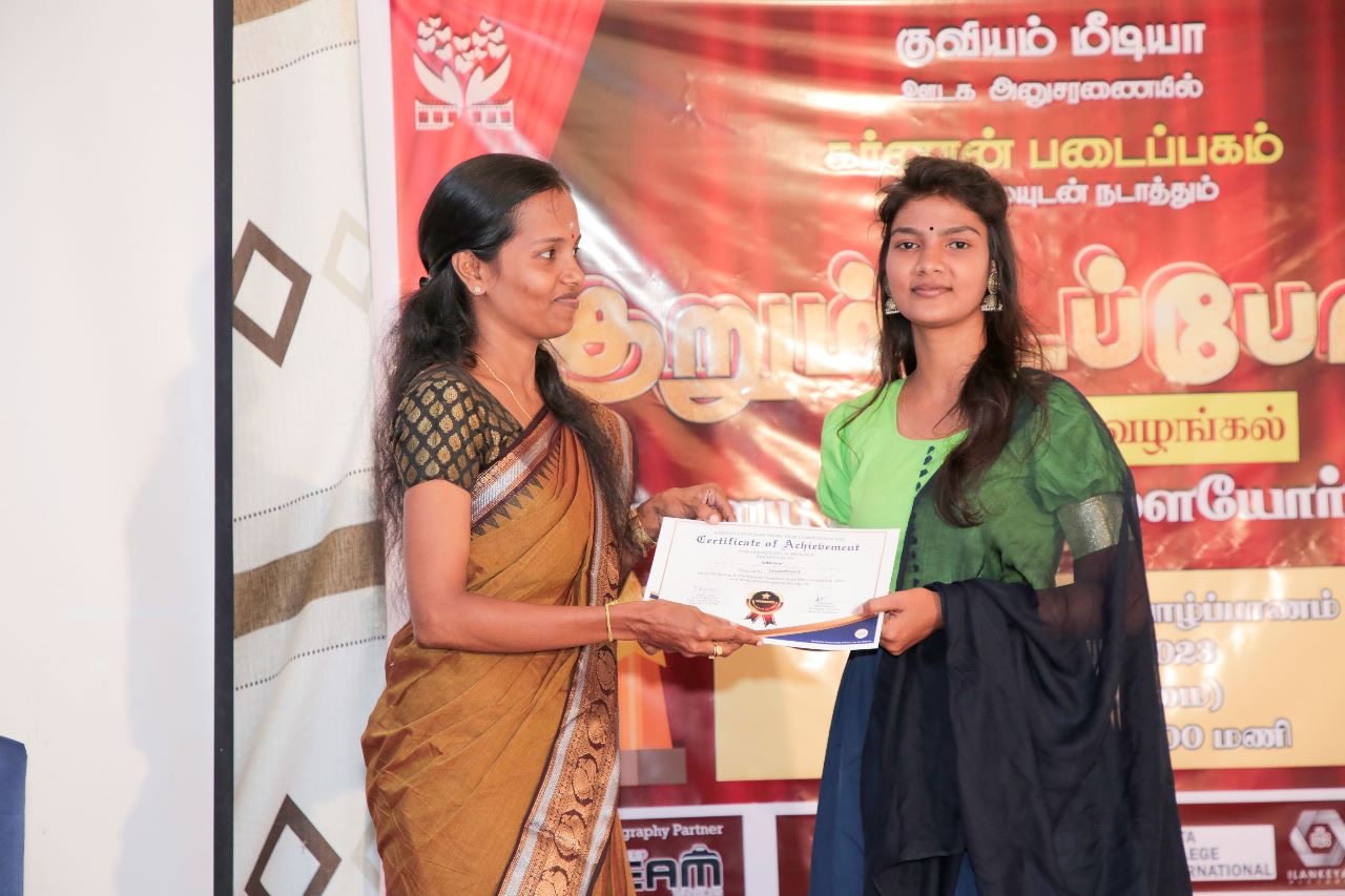 தவிர, முதல் 10 இடங்களுக்குள் தெரிவான ஏனைய 7 குறும்படங்களுக்கும் தலா 5 ஆயிரம் ரூபாய் பணப்பரிசும் சான்றிதழ் மற்றும் பதக்கங்களும் வழங்கி வைக்கப்பட்டன.