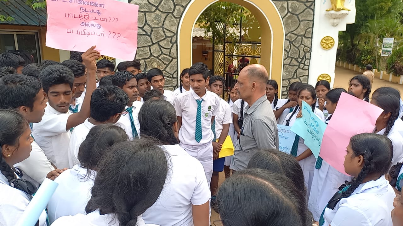 இதனையடுத்து சம்பவ இடத்திற்கு வந்த தெல்லிப்பழை கோட்டக் கல்வி பணிப்பாளர் வே.அரசகேசரி மாணவர்களுடன் கலந்துரையாடியதை அடுத்து மாணவர்கள் அங்கிருந்து கலைந்து சென்றனர்.