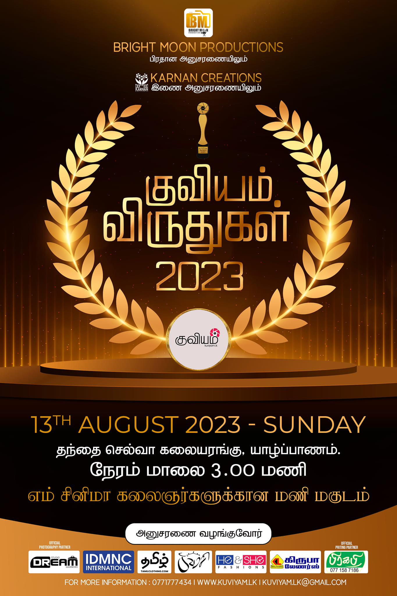 இலங்கைத் தமிழ் சினிமாக் கலைஞர்களுக்கான மாபெரும் விருது விழாவான “குவியம் விருதுகள் 2023” நிகழ்வு நாளை ஞாயிற்றுக்கிழமை மாலை 3 மணியளவில் யாழ்ப்பாணம் தந்தை செல்வா கலையரங்கில் (யாழ். மத்திய கல்லூரிக்கு அருகில்) இடம்பெறவுள்ளது.