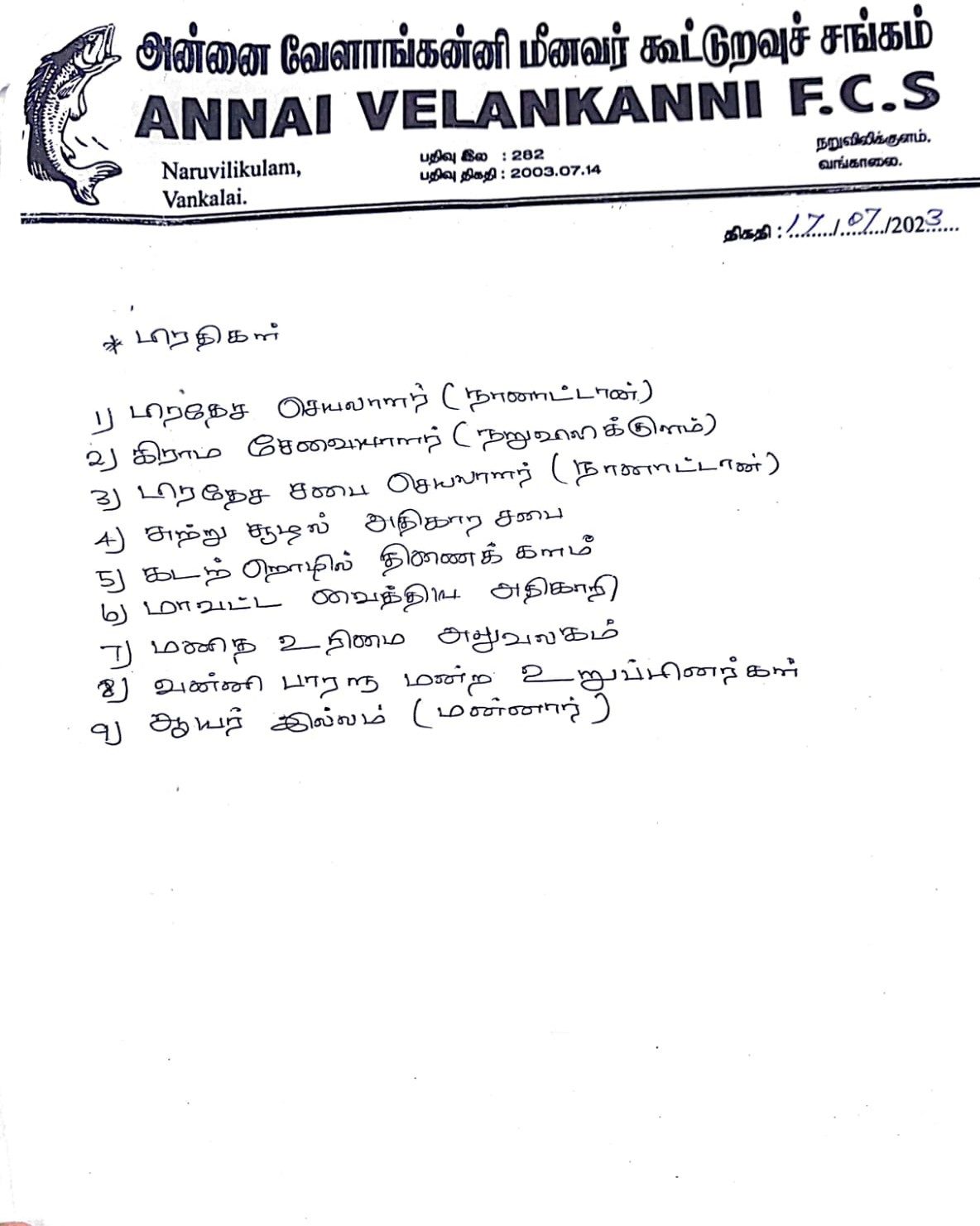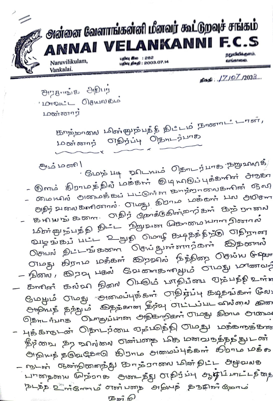 17.07.2023 திகதியிடப்பட்டு அன்னை வேளங்கன்னி மீனவர் சுட்டுறவுச் சங்கத்தினால் மன்னார் மாவட்ட அரசாங்க அதிபர் அவர்களுக்கு கடிதம் மூலம் நறுவிலிக்குளம் கிராமத்தில் மக்கள் குடியிருப்புக்களின் அருகாமையில் அமைக்கப்பட்டுள்ள காற்றாலைகளின் ஒலி அதிர்வலைகளினால் கிராமமக்கள் அசோகரியங்களை எதிர்நோக்குகின்றார்கள். மின்னுற்பத்திதிட்ட முகாமையாளரினால் வழங்கப்பட்ட உறுதிமொழி கடிதத்திற்கு எதிரான செயற்திட்டங்களை செய்துள்ளார்கள். இதற்கு பொறுப்பான அதிகாரிகள் தீர்வினைப் பெற்றுத்தரவில்லை என்பதனை குறிப்பிட்டு அரசாங்க அதிபர் அவர்கட்கு கடிதம் அனுப்பப்பட்டுள்ளமை குறிப்பிடத்தக்கது.