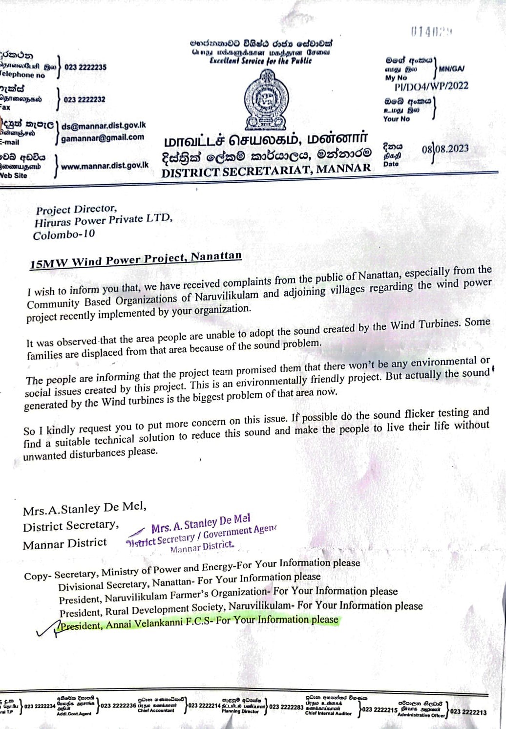 தங்கள் Hiruras Power Private LTD கம்பனியினால் அண்மையில் நடைமுறைப்படுத்தப்பட்ட 15MW WIND POWER PROJECT காற்றாலை மின்சாரத்திட்டம் தொடர்பில் நானாட்டானைச் சேர்ந்த பொதுமக்களிடமிருந்து குறிப்பாக நறுவிலிக்குளம் மற்றும் அதனை அண்டிய கிராமங்களைச் சேர்ந்த சமூக மட்ட அமைப்புக்களிடமிருந்து முறைப்பாடுகள் கிடைத்துள்ளன என்பதை தெருவித்துக்கொள்கின்றேன். காற்றாலைகளினால் உருவாகும் ஒலியை குறித்த பகுதிமக்கள் ஏற்றுக்கொள்ள முடியாமல் தவிப்பதை அவதானிக்க முடிந்தது. ஒலி பிரச்சனையால் சில குடும்பங்கள் அந்த பகுதியில் இருந்து இடம்பெயர்ந்துள்ளனர்.