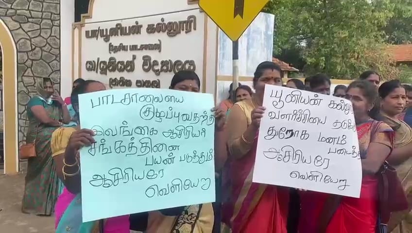 ஆசிரியர் சங்கமொன்றினை பயன்படுத்தி தமது சொந்த நலனை அடிப்படையாக கொண்டு பாடசாலைக்கு எதிரான செயற்பாடுகளை தொடர்ந்தும் செய்வதாக குற்றம் சாட்டிய பெற்றோர் குறித்த ஆசிரியருக்கு இடமாற்றம் வழங்கவேண்டும் என தெரிவித்தனர்.