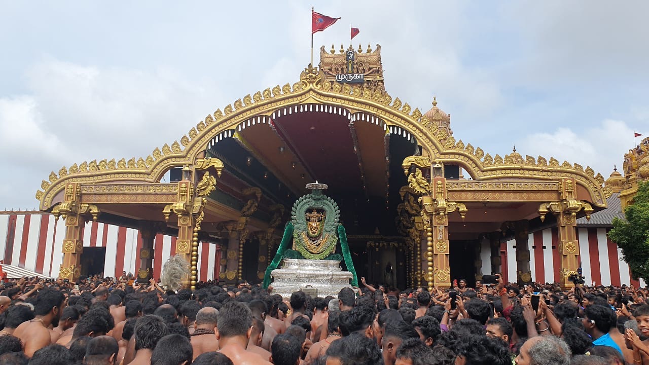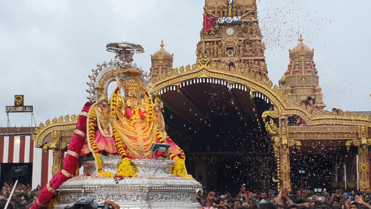 தேரில் வெளிவீதி உலா வந்த ஆறுமுக பெருமான் காலை 8.45 மணிக்கு தேர் இருப்பிடத்தை வந்தடைந்தார்.