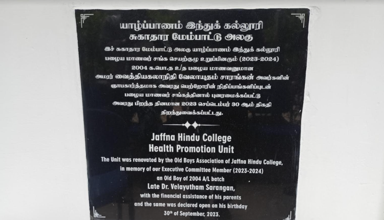 சாரங்கன் நினைவாக யாழ்ப்பாணம் இந்துக் கல்லூரி சுகாதார மேம்பாட்டு அலகு திறப்பு