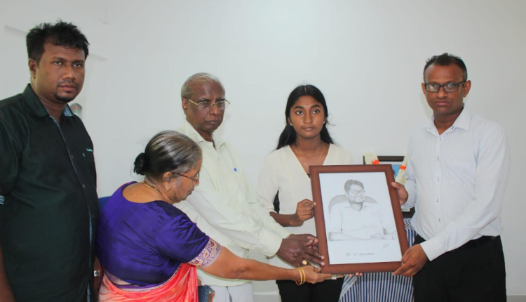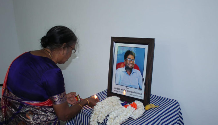 சாரங்கனின் திருஉருவப்படுத்திற்கு சாரங்கனின் தாயார் விளக்கேற்றி மலர்மாலை அணிவித்தார்.