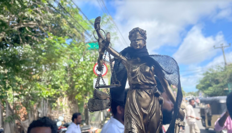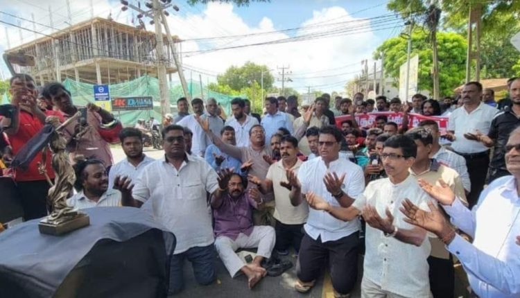 யாழ்ப்பாணத்தில் சட்டத்தரணிகள் நீதி தேவதையிடம் மண்டியிட்டு , நீதிபதிக்கு நீதி கோரினர்.