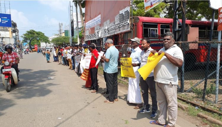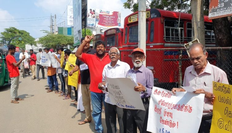 சமூக நீதிக்கான வெகுஜன அமைப்பின் ஏற்பாட்டில் இன்று காலை 10 மணியளவில் யாழ் மத்திய பேரூந்து நிலையத்திற்கு முன்பாக இப்போராட்டம் இடம்பெற்றது.
