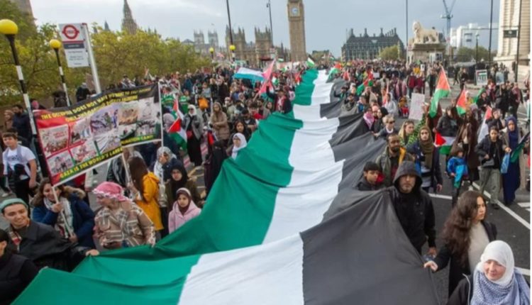 இந்நிலையில் பாலஸ்தீனத்திற்கு ஆதரவாக லண்டனில் ஆர்ப்பாட்டம் நடைபெற்று வருவதாக தெரியவந்துள்ளது.