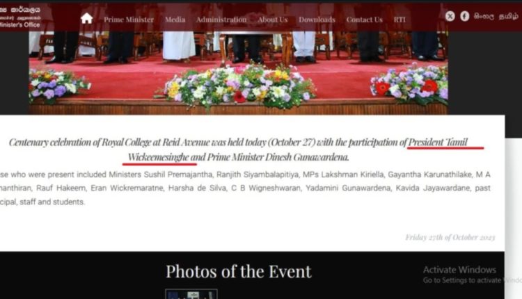 கடந்த 27ஆம் திகதி ஜனாதிபதி ரணில் விக்ரமசிங்க மற்றும் பிரதமர் தினேஷ் குணவர்தன தலைமையில் ரீட் மாவத்தை றோயல் கல்லூரியில் நடைபெற்ற நூற்றாண்டு விழா தொடர்பான செய்தியில் பிரதமர் அலுவலகம் ஜனாதிபதியின் பெயர் தவறாக பிரசுரிக்கப்பட்டது.