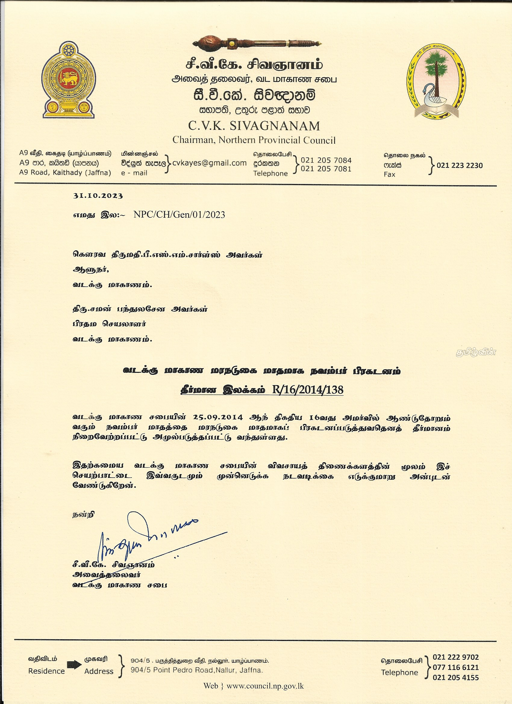 வடக்கு ஆளுநர் பி.எஸ்.எம்.சார்ள்ஸ், வடக்கு மாகாண பிரதம செயலாளர் சமன் பந்துலசேன ஆகியோருக்கு வடக்கு மாகாண சபை அவைத் தலைவர் சி.வீ.கே.சிவஞானம் நேற்று (31.10.2023) அனுப்பி வைத்துள்ள கடிதத்திலேயே இவ்விடயம் தெரிவிக்கப்பட்டுள்ளது.