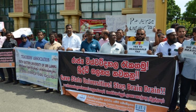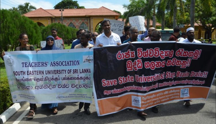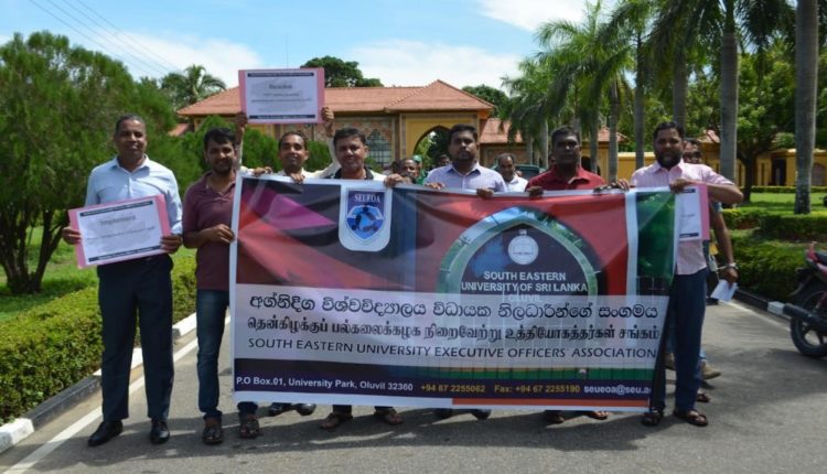 நாட்டின் கடுமையான பொருளாதார நெருக்கடியால் சடுதியாக அதிகரித்துள்ள வாழ்க்கை செலவுகளை ஈடுசெய்ய முடியாத நிலையில் நீண்ட கால சம்பள முரண்பாடுகள் உள்ளிட்ட பல்வேறு குறைபாடுகளை சீர்செய்ய விடுக்கப்பட்ட கோரிக்கைகள் தொடர்ந்து உதாசீனம் செய்யப்படுவதை வெளிக்கொணருமுகமாக அனைத்து பல்கலைக்கழகங்களிலும் இன்று அடையாள வேலைநிறுத்தம் இடம்பெற்று வரும் நிலையிலேயே தென்கிழக்கு பல்கலை கழகத்திலும் வேலை நிறுத்த போராட்டம் இடம்பெற்றது.