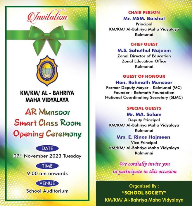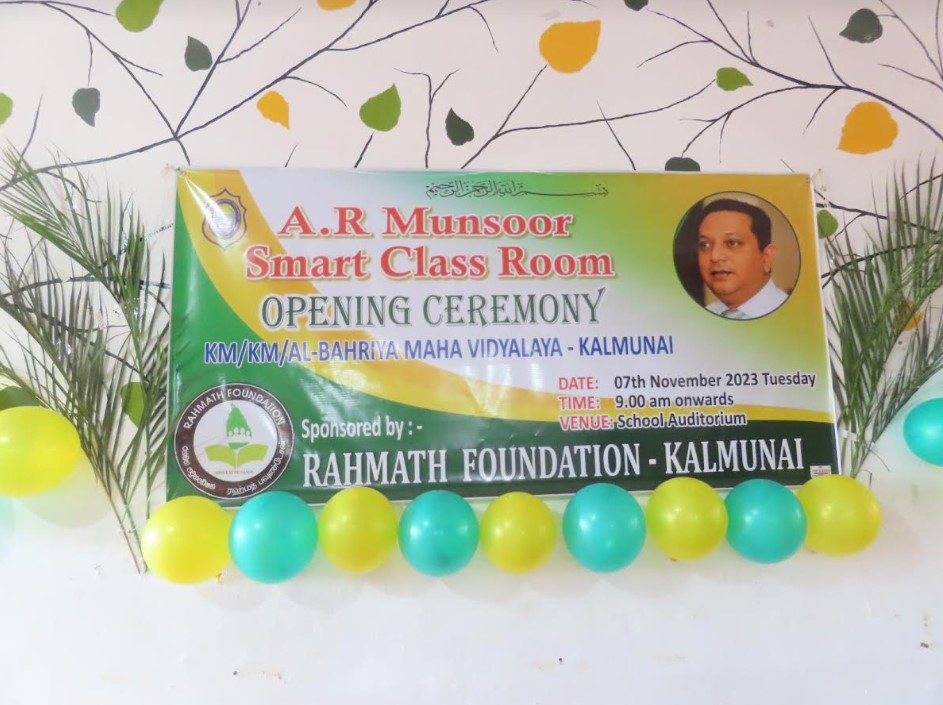 அம்பாறை மாவட்டம் கல்முனை கல்வி வலயத்திற்கு உட்பட்ட அல் பஹ்ரியா மகா வித்தியாலய (தேசிய பாடசாலை) முதலாவது இலத்திரனியல் வகுப்பறை(Smart class room) வகுப்பிற்கான உபகரணங்கள் வழங்கும் நிகழ்வு இன்று (7) பாடசாலை அதிபர் எம்.எஸ்.எம். பைஸால் தலைமையில் சிறப்பாக இடம்பெற்றது.
