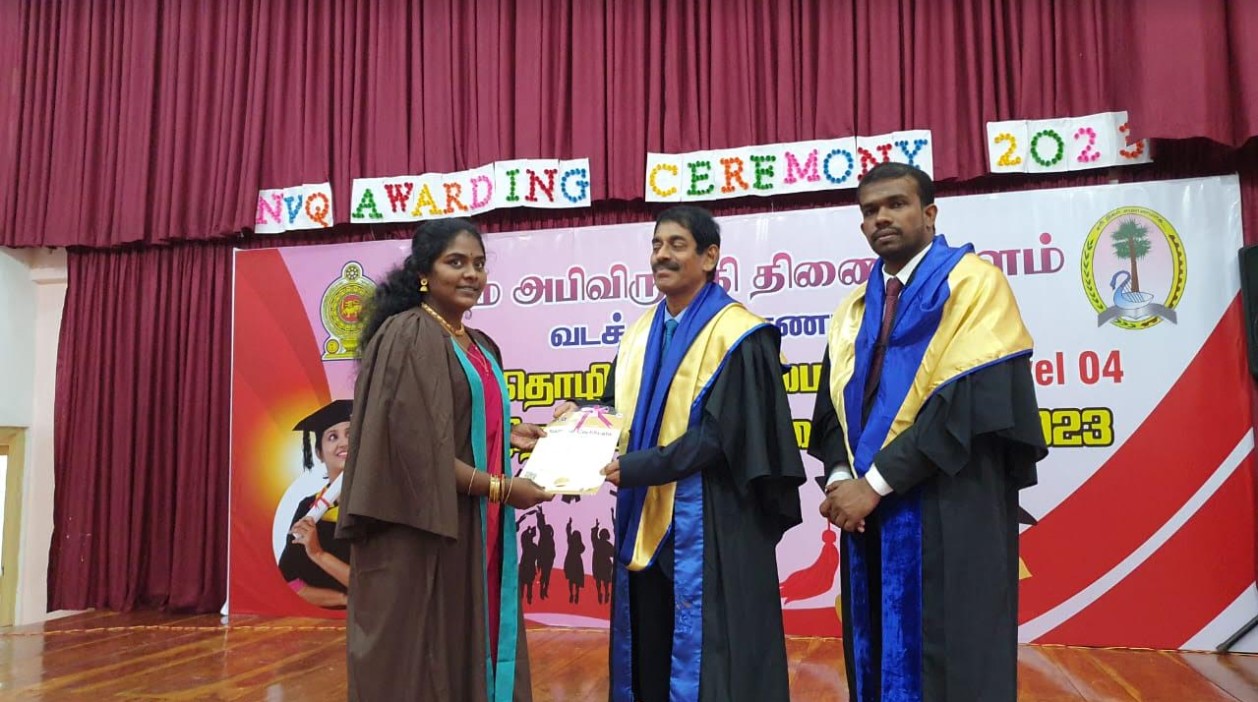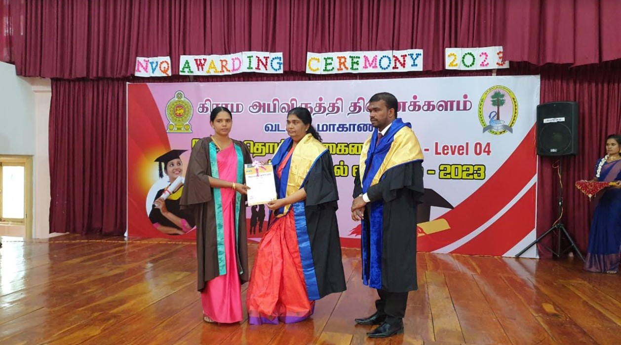 வடக்கு மாகாண கிராம அபிவிருத்தி திணைக்களத்தின் கீழ் இயங்கும் மகளிர் அபிவிருத்தி நிலையங்களில் மனைப் பொருளியலில் டிப்ளமோ கற்கைநெறி பூர்த்தி செய்து, ஆடை வடிவமைப்பில் தேசிய தொழிற்தகைமையை பெற்றுக் கொண்டவர்களுக்கு சான்றிதழ் வழங்கும் வைபவம் வியாழக்கிழமை நடைபெற்றது.