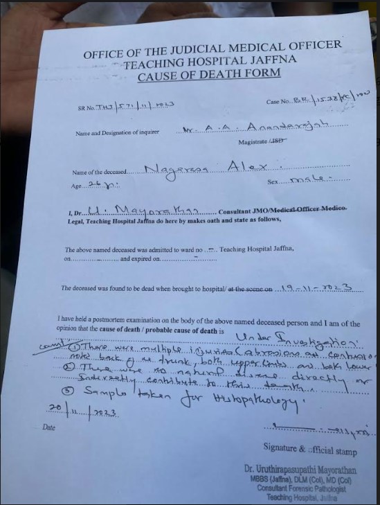 உயிரிழந்தவரின் சடலம் உடற்கூறு பரிசோதனைக்காக யாழ்ப்பாணம் போதனா மருத்துவமனை சவ அறையில் வைக்கப்பட்டிருந்தது. உடற்கூறு பரிசோதனையின் பின்னரே உயிழப்புக்கான காரணம் வெளியிடப்பட்டுள்ளது.