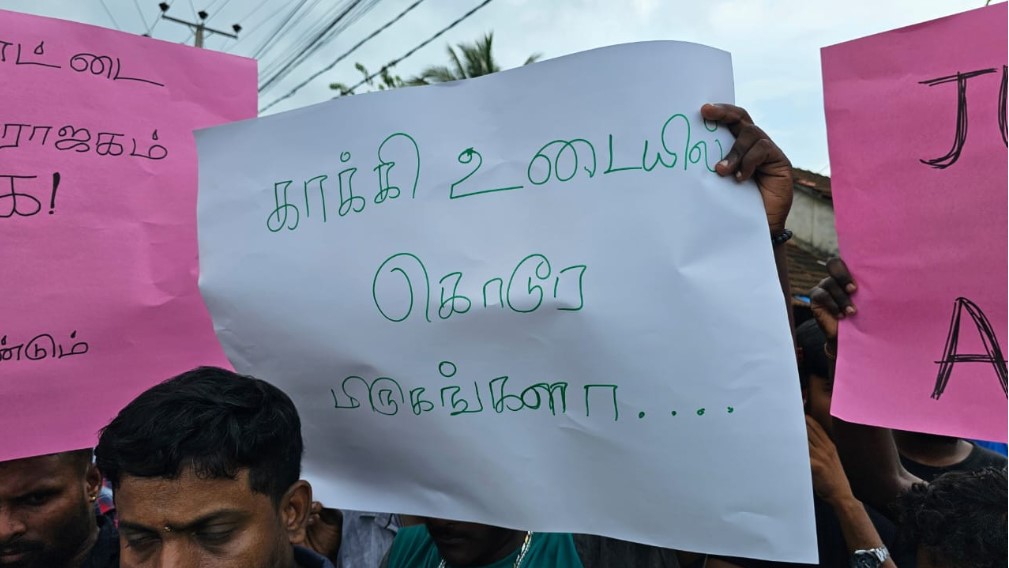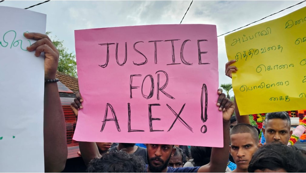 மேலும், அப்பாவி இளைஞனை அடித்து கொலை செய்த காவல்துறையினர் கைது செய்யப்பட வேண்டும், அலெக்ஸிற்கு நீதி வேண்டும் என்ற வாசகங்கள் எழுதிய பதாதைகளை ஏந்தியவாறும் மக்கள் போராட்டத்தில் ஈடுபட்டுள்ளனர்.
